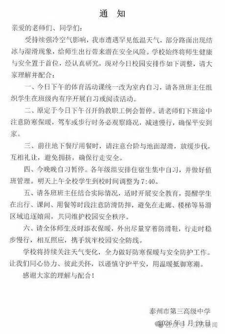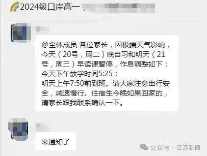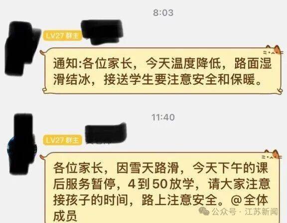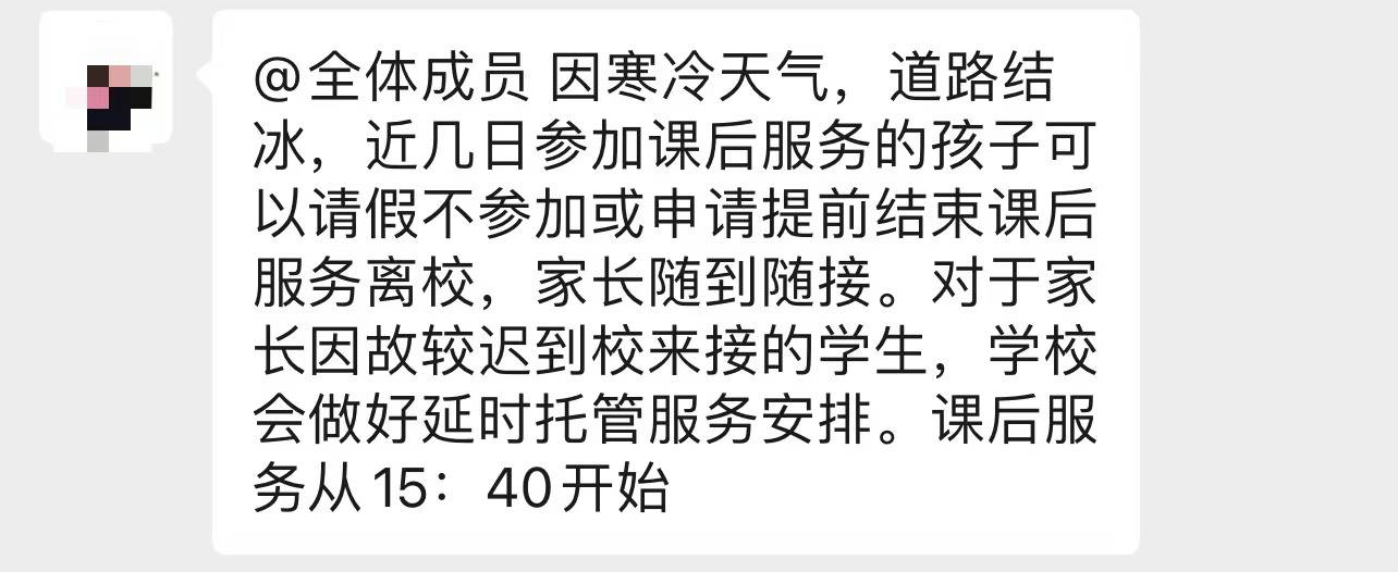 南京市游府西街小学也通知家长:@全体成员, 因寒冷天气,道路结冰,近几日参加课后服务的孩子可以请假不参加或申请提前结束课后服务离校,家长随到随接。对于家长因故较迟到校来接的学生,学校会做好延时托管服务安排。课后服务从15:40开始。