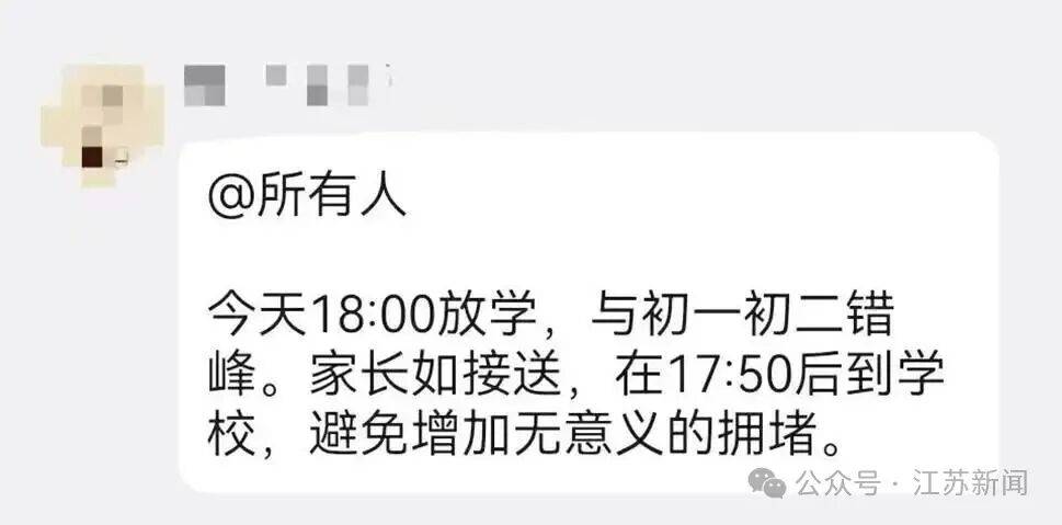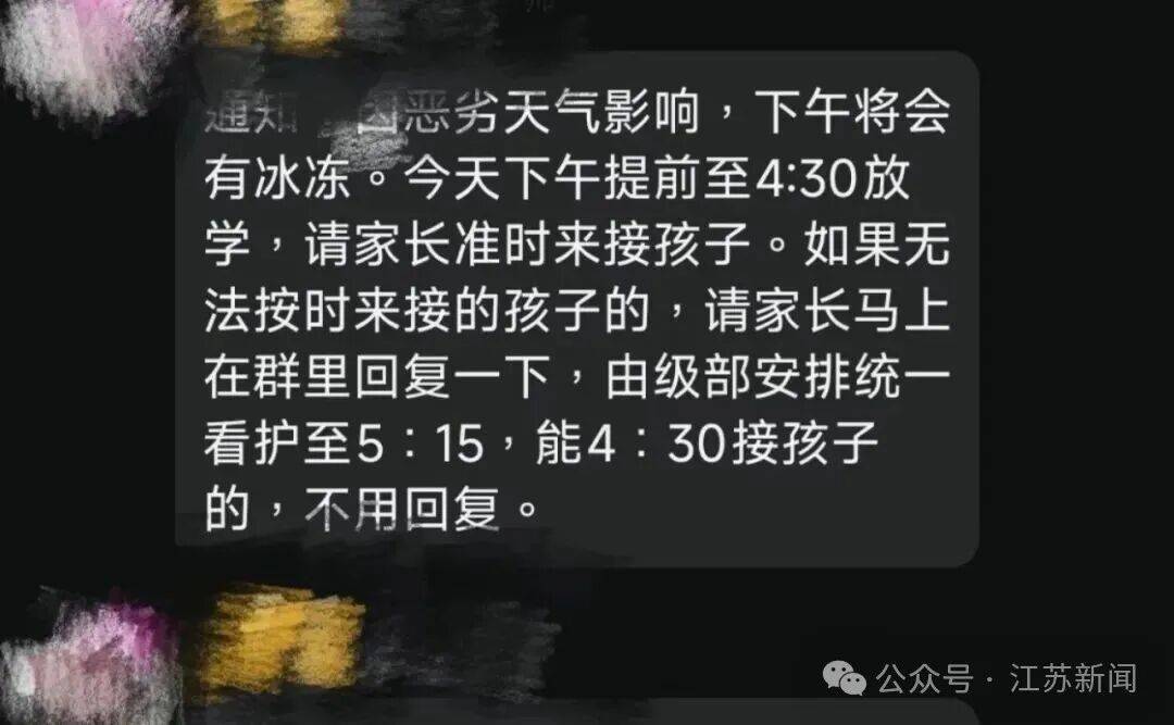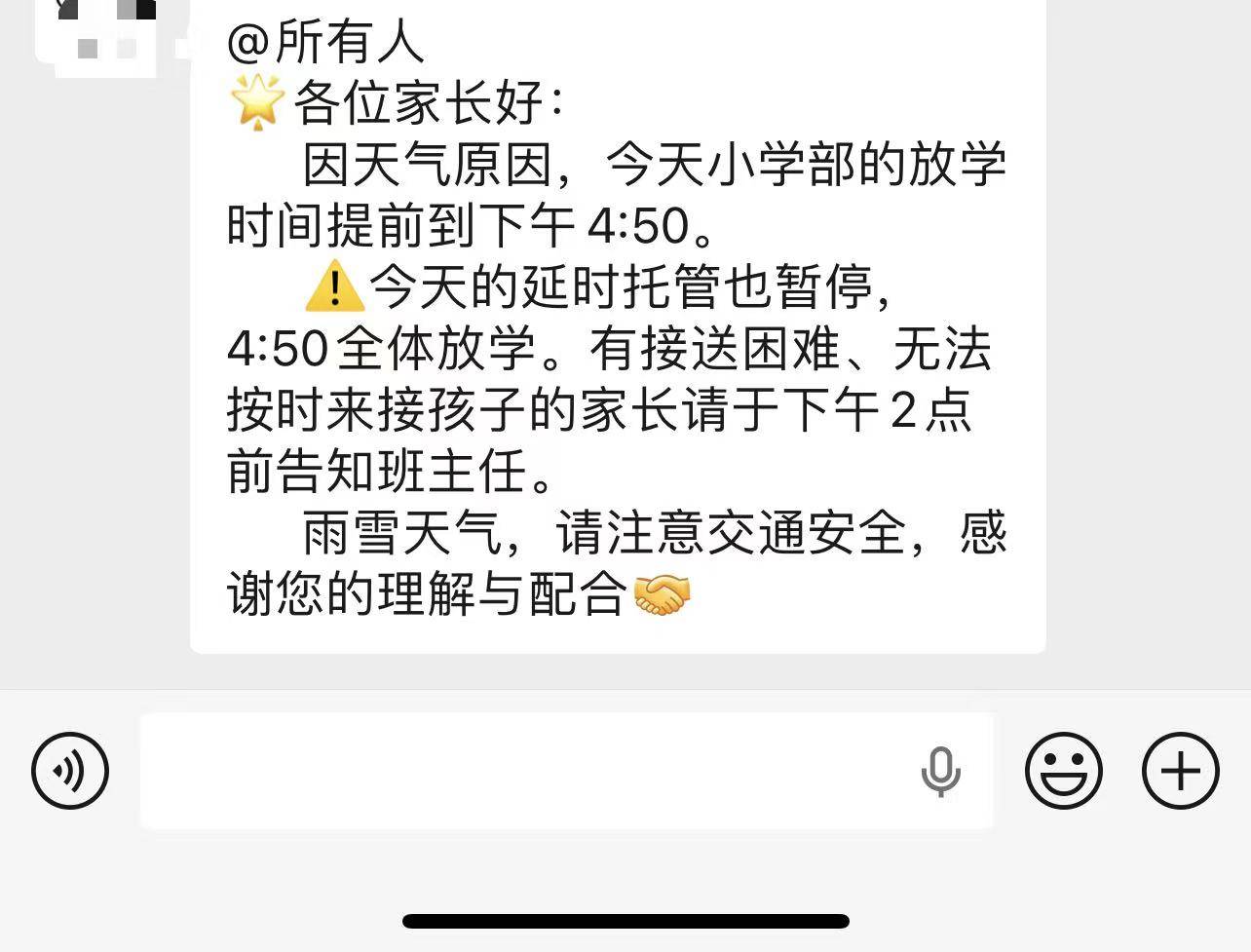 下午,南京雨花外国语学校小学生家长收到老师通知:各位家长好: 因天气原因,今天小学部的放学时间提前到下午4:50。今天的延时托管也暂停,4:50全体放学。有接送困难、无法按时来接孩子的家长请于下午2点前告知班主任。雨雪天气,请注意交通安全,感谢您的理解与配合。