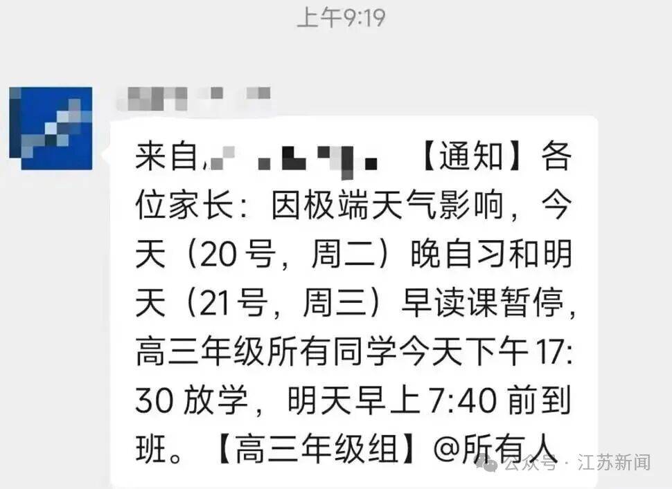 1月20日下午,因雨雪天气原因,江苏多校通知下午提前放学。