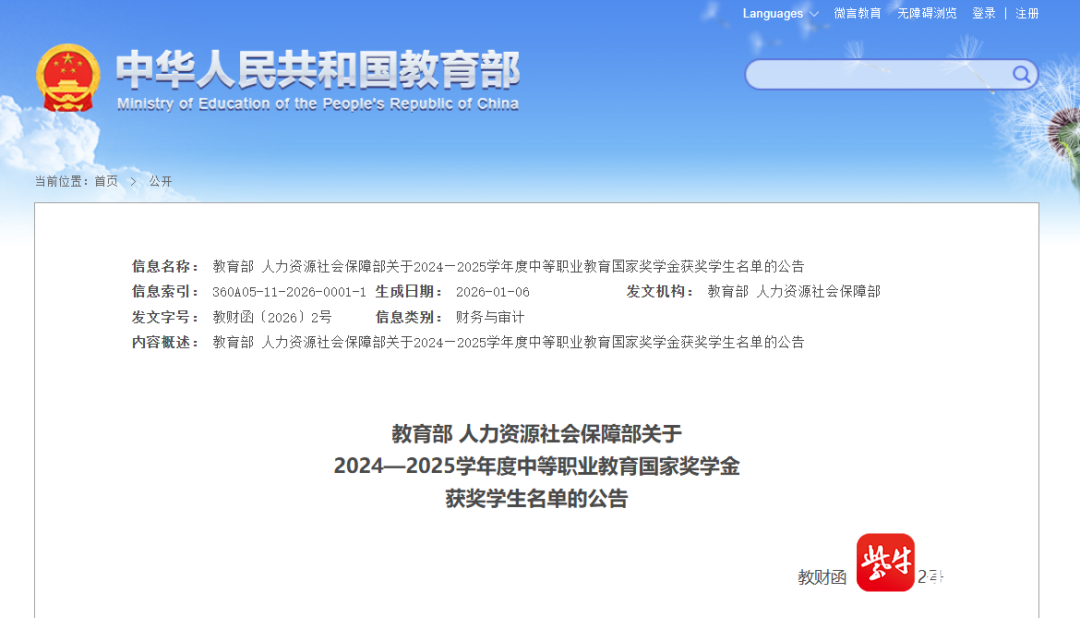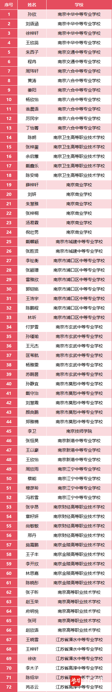 近日,教育部、人力资源社会保障部发布2024-2025学年度中等职业教育国家奖学金获奖学生名单,南京共有72名学生获奖,每人奖励6000元。一起来看获奖名单——