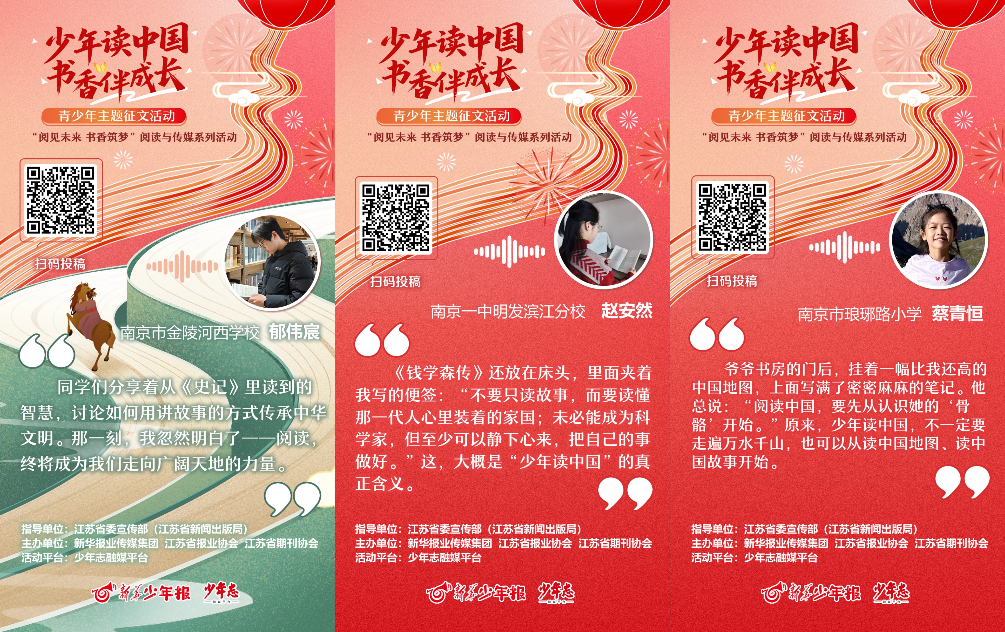 阅读是跨越时空的对话,更是青少年认识中国、滋养成长的重要途径。作为“阅见未来 书香筑梦”阅读与传媒系列活动的重要内容之一,由江苏省委宣传部(江苏省新闻出版局)指导,新华报业传媒集团、江苏省报业协会、江苏省期刊协会主办,以少年志融媒平台为活动平台的“少年读中国·书香伴成长”青少年主题征文活动启动一周以来,少年志融媒平台已收到全省中小学生的海量来稿。