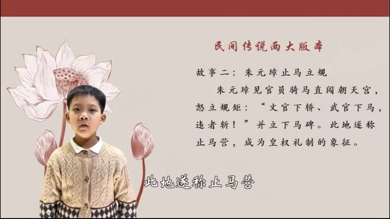 “借助AI统计,南京大约有近200个贷‘马’字的地名。以我们秦淮区为例:有马府街、马道街、泥马巷、饮马巷、止马营等。我研究的是止马营,位于朝天宫西南侧,是明代洪武年间皇家礼仪禁地。”五(7)班袁安晨介绍,关于“止马营”,民间传说有两大版本:故事一与马皇后救民有关:朱元璋因画师画的一幅画震怒,想杀画师。一名奸臣在他家门头上插了一束芝麻秸作为标记,请皇上派兵前去捉拿,马皇后深夜拦驾,以“日月为明”点醒皇帝,救下画师。百姓感念,称此地为“芝麻营”,后谐音“止马营”。故事二与朱元璋止马立规有关:朱元璋见官员骑马直闯朝天宫,怒立规矩:“文官下轿,武官下马,违者斩!”并立下马碑。此地遂称止马营,成为皇权礼制的象征。“止马营不只是一个普通的老地名,更是六百余年皇权礼制、民间温情与市井生活的交织体。”