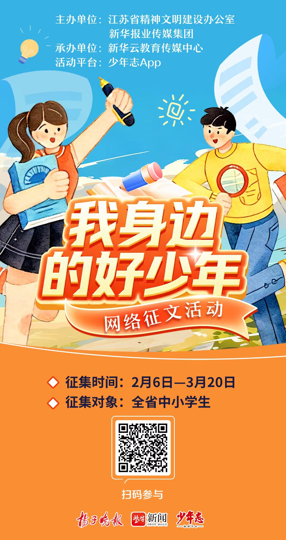 如今,廖峥骐用题为《羽球少年,闪耀赛场》的作文,让宝藏少年司恒硕的故事被更多人了解,“我身边的好少年”网络征文活动也仍在进行中。2026年3月20日前,期待能有更多同学们拿起笔,扫描文中二维码参与投稿,晒出身边的宝藏少年榜样。愿每一位同学都能找到自己的身边榜样,成为更好的自己!
