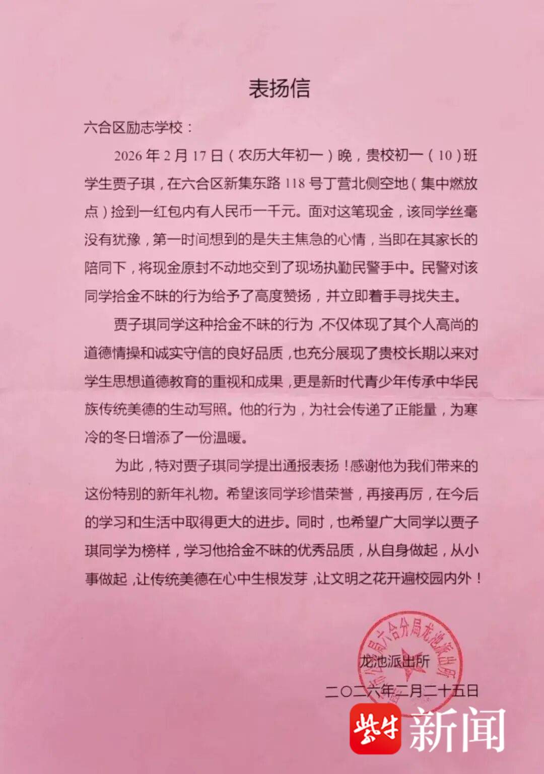 龙池派出所副所长王亚伟表示,贾子琪同学拾金不昧的行为不仅体现了个人高尚的道德情操和诚实守信的良好品质,也充分展现了南京市六合区励志学校长期以来对学生思想道德教育的重视和成果,更是新时代青少年传承中华民族传统美德的生动写照。