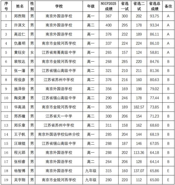 全国青少年信息学奥林匹克竞赛(NOI 2026)江苏省队选拔活动于3月7日-8日举行。根据《CCF NOI 2026江苏省代表队选拔活动方案》和《CCF NOI2026名额分配方案》,江苏省省队A、B类名额共17人(A队由4名男生和1名女生组成),现对NOI2026江苏省省队入选名单进行公示如下: