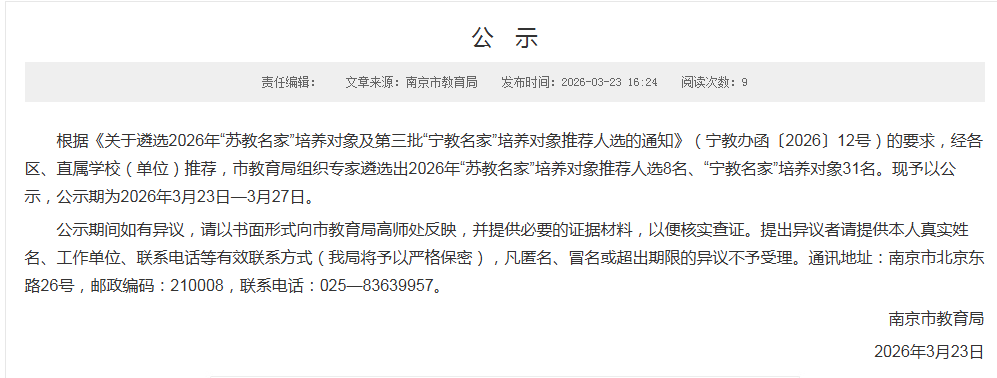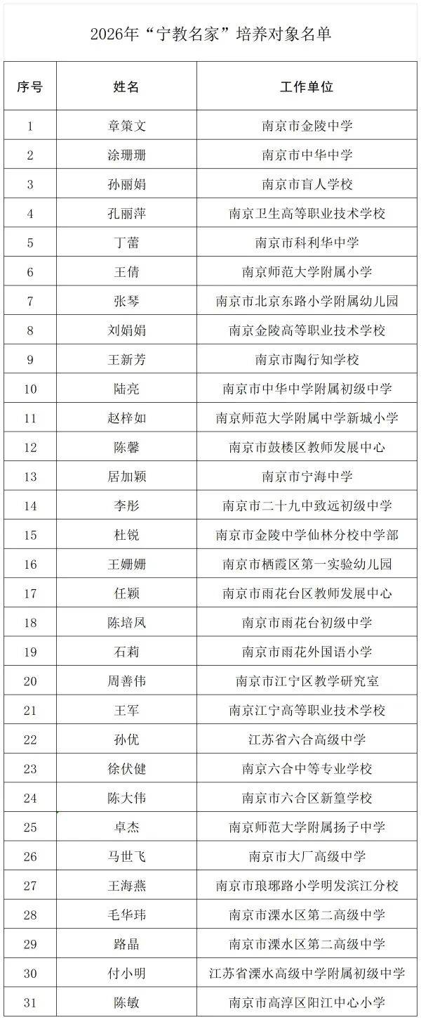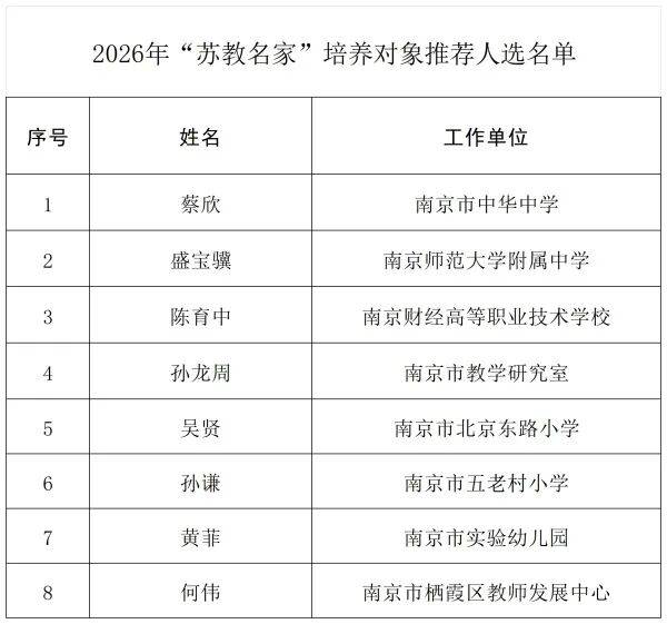 扬子晚报网讯(扬子晚报/紫牛新闻记者 王颖)刚刚,南京市教育局发布《关于遴选2026年“苏教名家”培养对象及第三批“宁教名家”培养对象推荐人选的通知》,看看有没有你认识的老师?