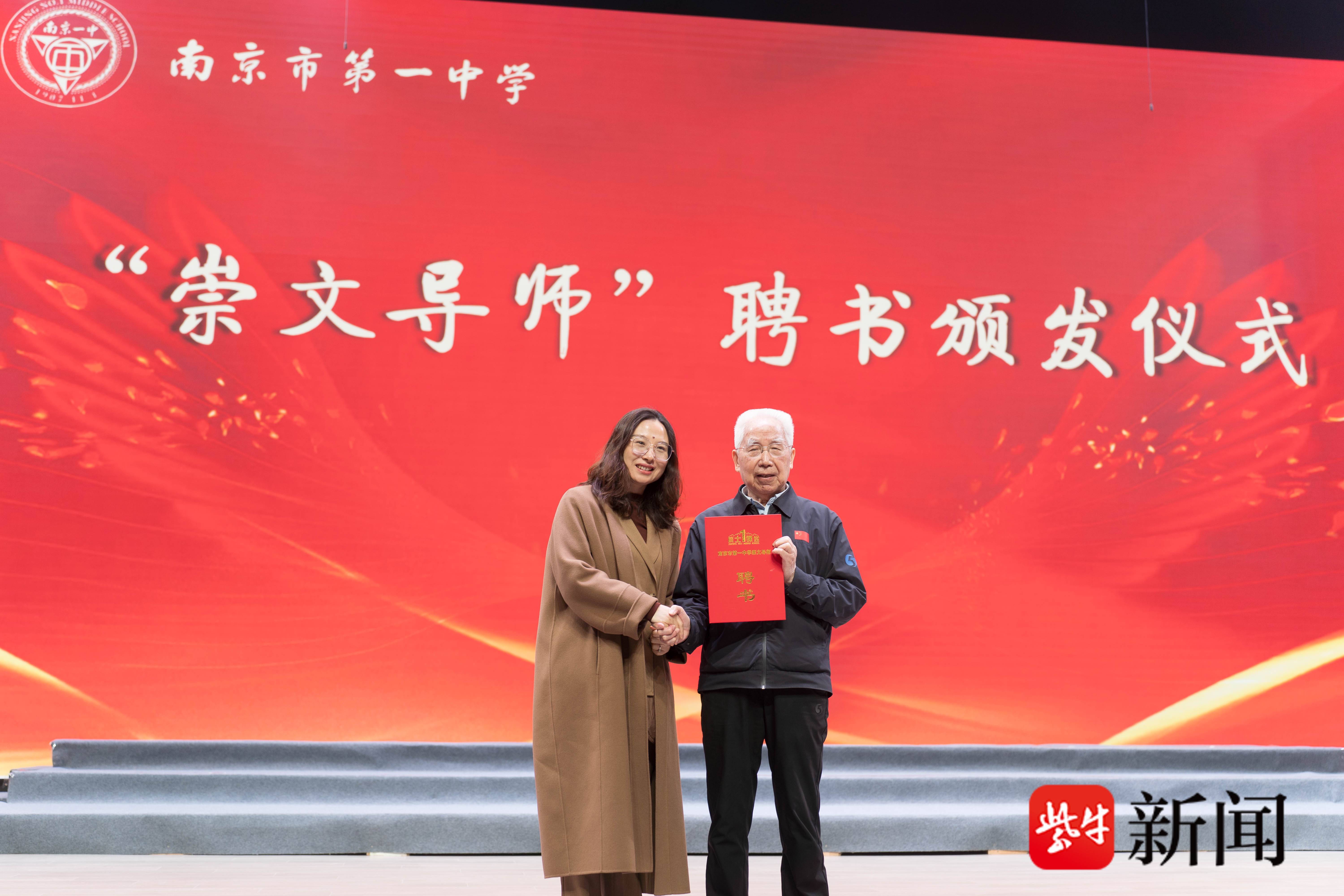 讲座结束后,南京一中党委书记居艳向龙乐豪院士颁发“崇文导师”聘书。