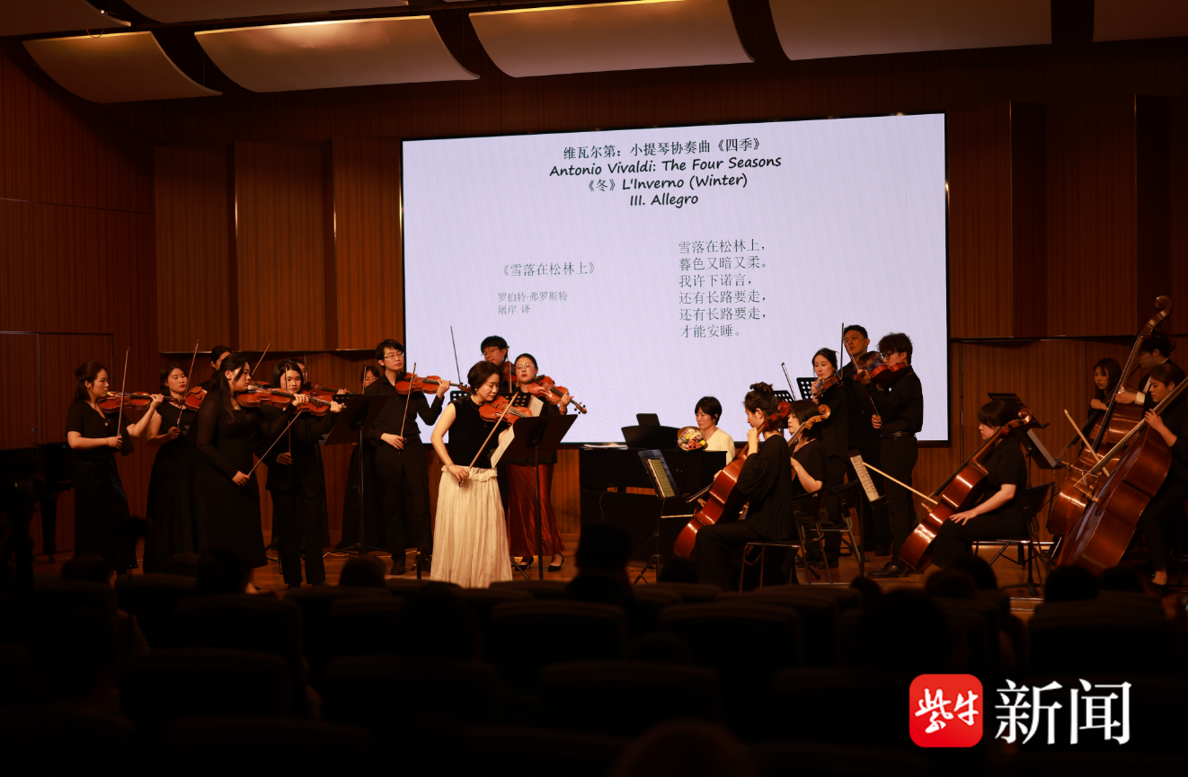 冬: 特别值得一提的是,吴旋在“冬”的篇章中引用了苏轼的经典诗句“一年好景君须记,最是橙黄橘绿时”,并在第三乐章配以弗罗斯特的《雪落在松林上》,实现了一场跨越千年的东西方文学与音乐的深度碰撞。这种“诗画合一”的呈现方式,在南京乃至国内的独奏音乐会舞台上都极为罕见,为观众留下了极大的想象空间。