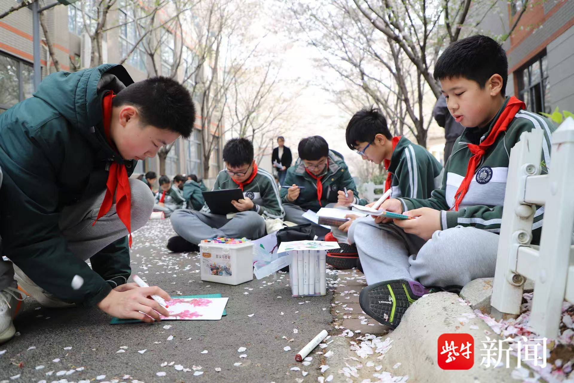 六(1)班吴钰滢兴奋地表示:“我和同学们一起到樱花大道来画樱花,先用浅色的丙烯马克笔画出很多圈,然后再在周围点上点,最后用深色的画笔画出主干。”