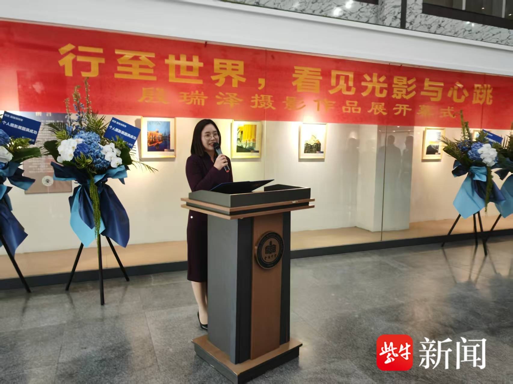 长廊两侧,60幅装裱精致的摄影作品静静悬挂。一幅名为《钟楼映水》的照片留住了许多师生的脚步——在一场雨后的蓝调时刻,熟悉的校园标志性钟楼倒映在一汪水潭中,空灵而幽静。而站在这组大片旁担任导览的,是这些作品的拍摄者——初二(15)班的殷瑞泽同学。