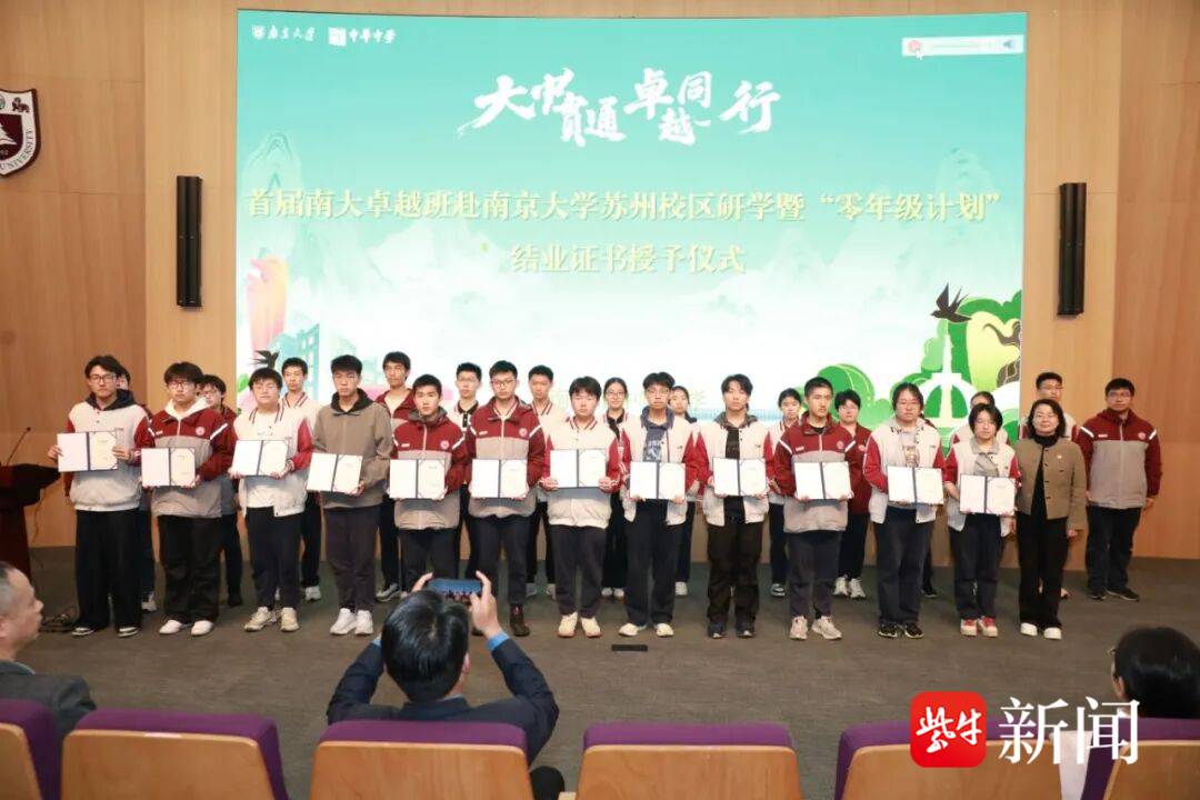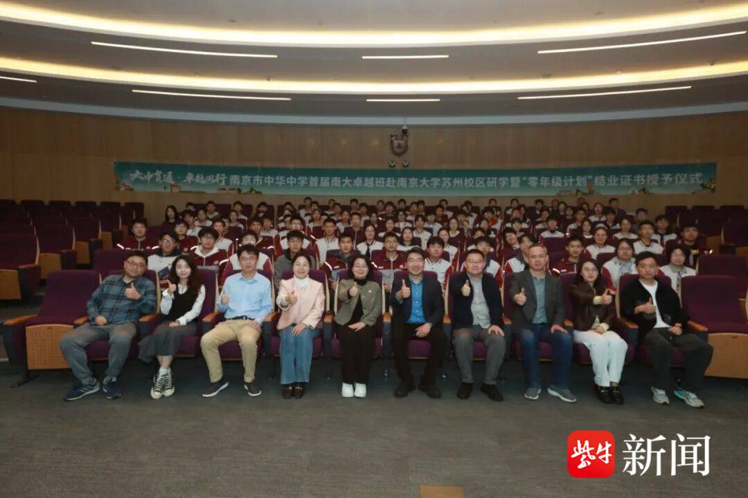 4月10日-4月11日,南京市中华中学高二年级南大卓越班学子走进南京大学苏州校区,与大学导师、学长学姐深度交流对话,参观先进实验室,入住学校国际交流中心,开启高校研学的深度体验。据了解,2025年,南京大学专门为中华中学开发“零年级课程”,助力拔尖创新人才的培养。4月12日,首批完成南京大学“零年级课程”的中华学子正式被授予结业证书。