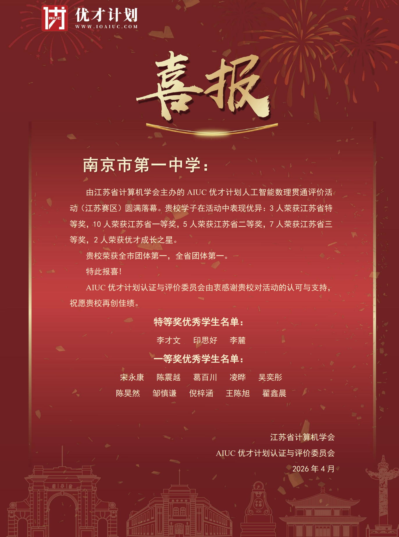 在此之前,由江苏省计算机学会主办的 AIUC 优才计划人工智能数理贯通评价活动(江苏赛区)圆满落幕。南京一中学子在活动中表现优异:3 人荣获江苏省特等奖,10人荣获江苏省一等奖,5人荣获江苏省二等奖,7人荣获江苏省三等奖,2人荣获优才成长之星。
