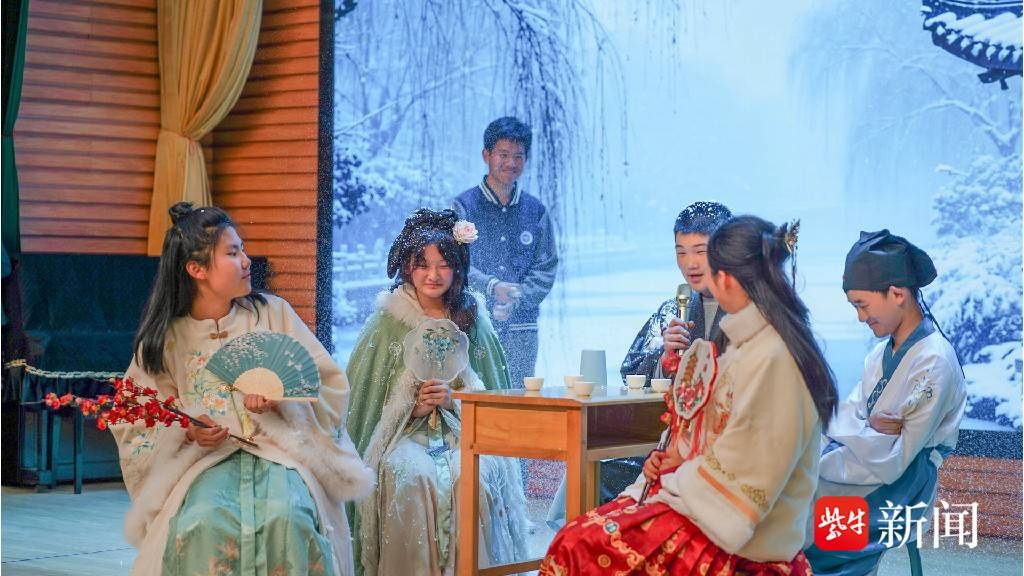 “朱雀桥边野草花,乌衣巷口夕阳斜……”学校润吾文学社的同学们带来课本剧《典籍里的南京》,将《世说新语》中《咏雪》的佳话搬上舞台。谢安因材施教、谢道韫才思敏捷,乌衣巷里的儒雅家风在同学们的演绎下跨越千年,赢得阵阵掌声。