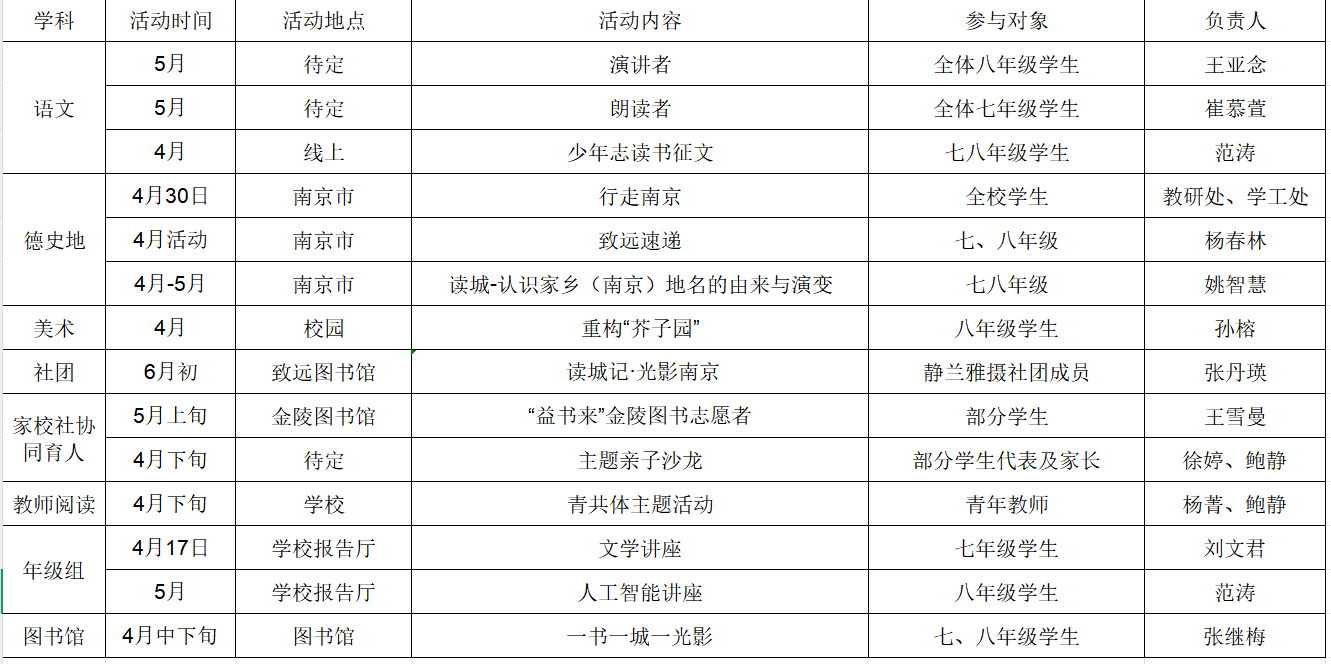 据介绍,本次读书节将有机融入“阅见未来 书香筑梦”阅读与传媒系列活动的多项内容,持续推出语文演讲征文、德史地“行走南京”、美术定格金陵、图书馆光影共读等多元活动,并推出“阅读学士、硕士、博士”阶梯式成长评级。让“腹有诗书气自华,最是书香能致远”成为每一位致远学子的精神底色。