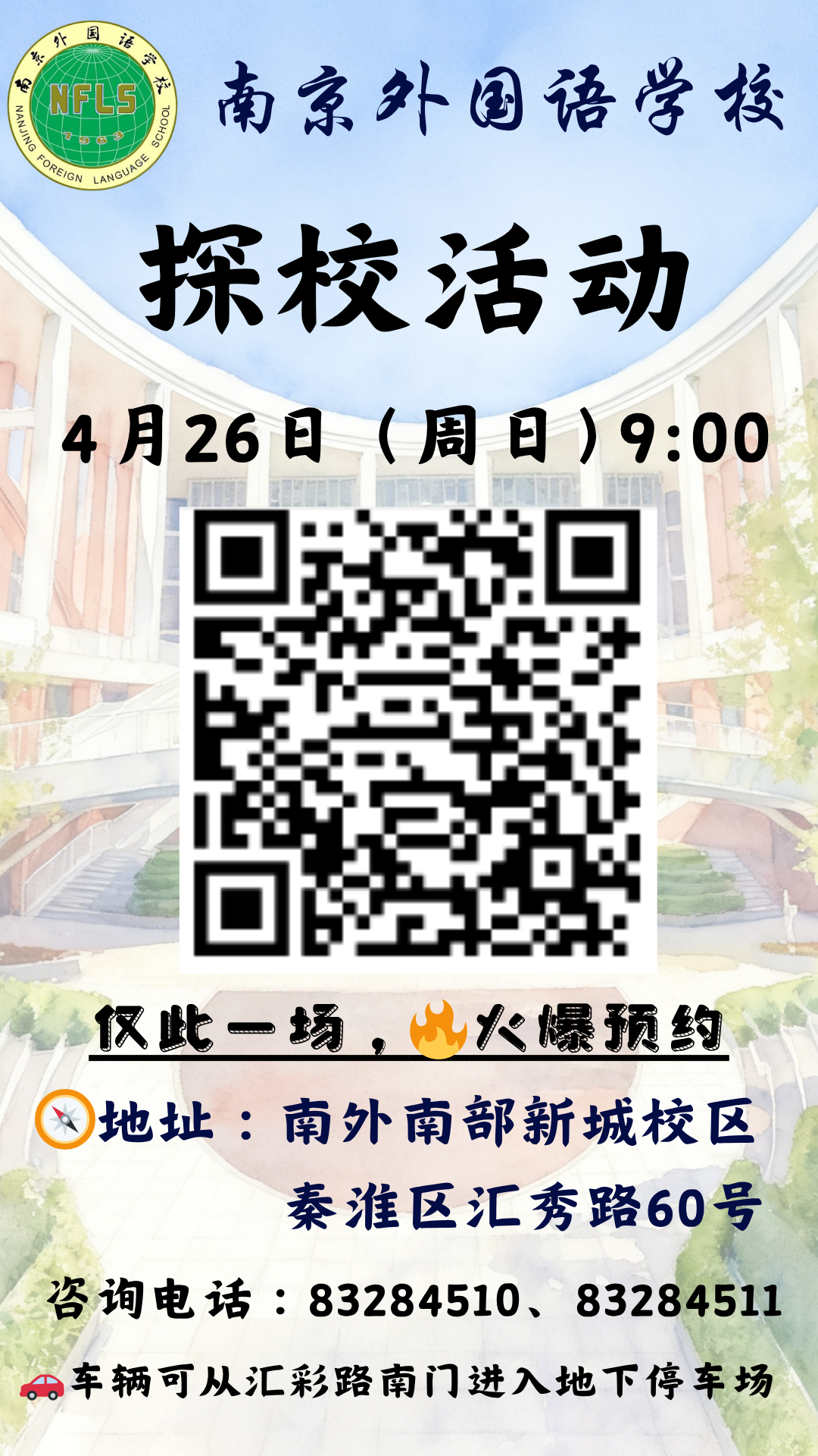 学校在官网(www.nfls.com.cn)、官微(南京外国语学校)公布招生简章,请考生关注相关信息,并填写《南京外国语学校普通高中对外招生考生信息登记表》。
