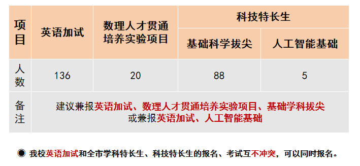面向全市应届初三毕业生,通过“科技特长生”专业加试方式录取93人。特长项目为“STEM强基计划后备人才培养”,其中“人工智能基础”方向5人,“基础科学拔尖”方向88人。