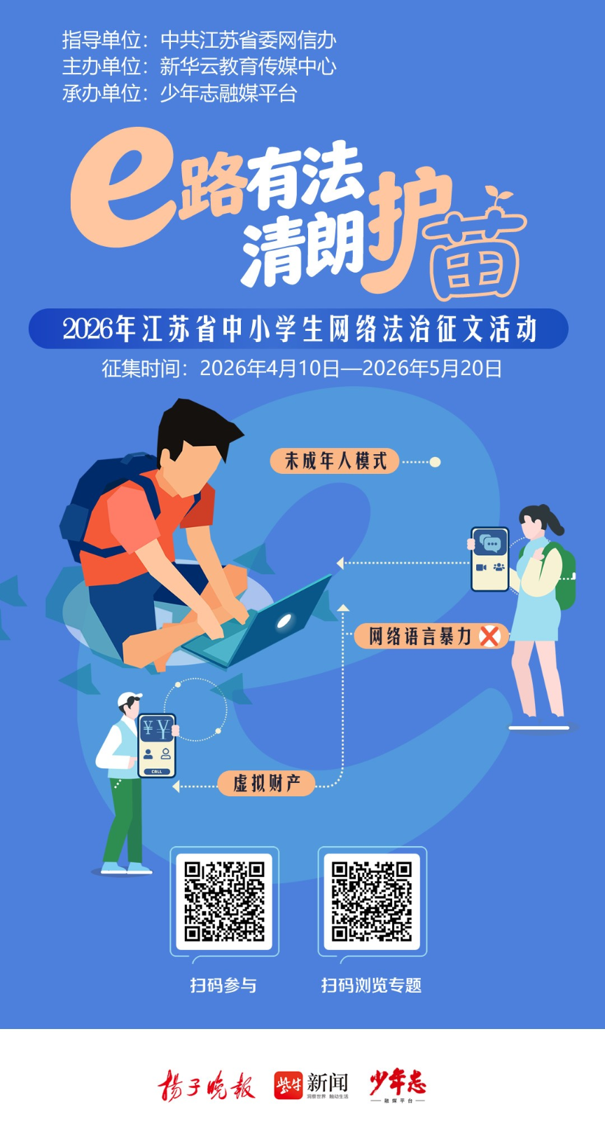 当“AI换脸”从娱乐工具演变为侵权隐患,当游戏皮肤等虚拟财产需要法律铠甲,青少年如何理解和宣传网络法治?近日,由中共江苏省委网信办指导、新华云教育传媒中心主办的“e路有法 清朗护苗”2026年江苏省中小学生网络法治征文活动,在少年志融媒平台持续掀起投稿热潮。同学们用兼具温度与锐度的文字,解读网络法治内涵,为同龄人送上量身定制的网络安全警示指南。