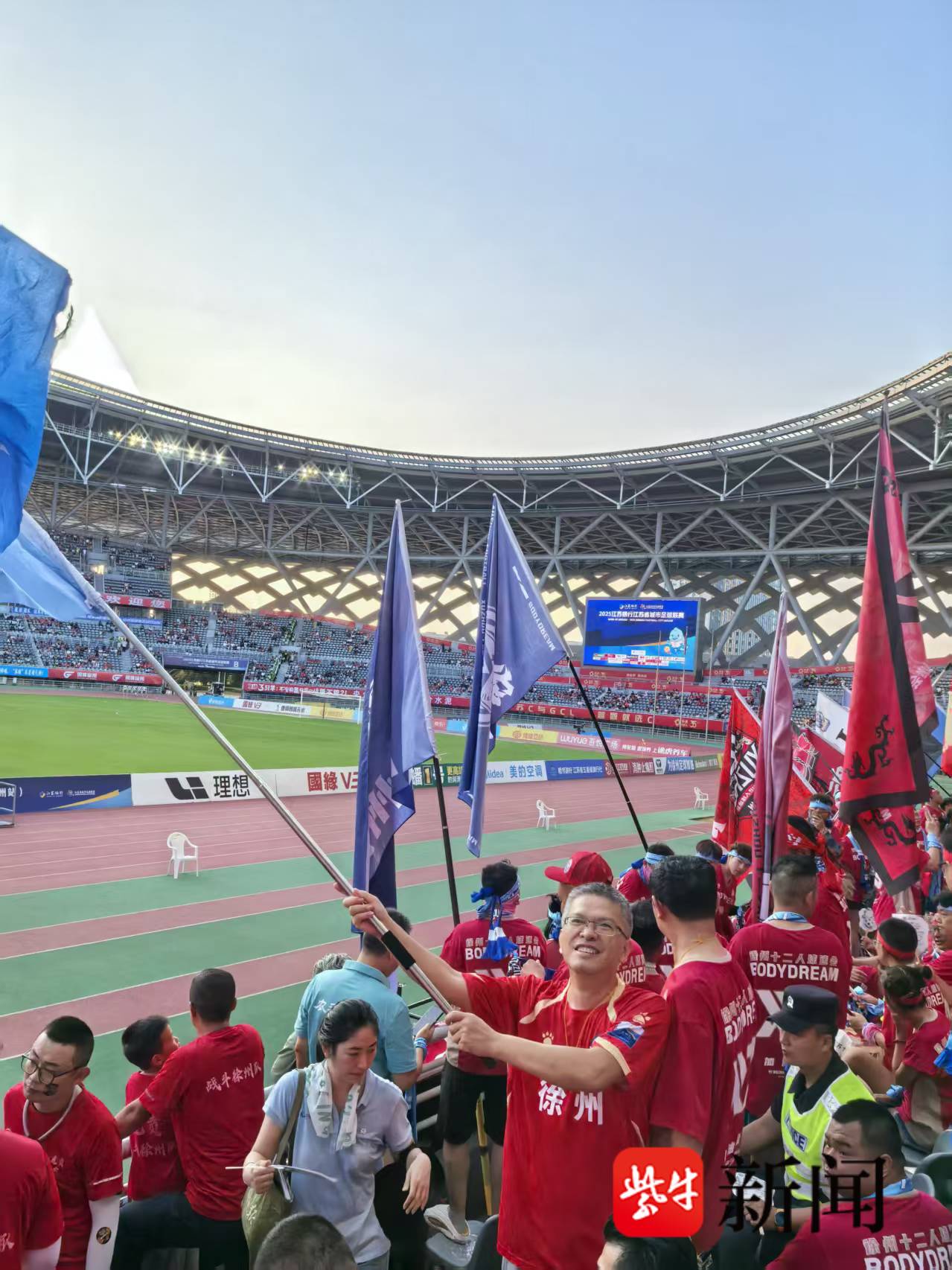 江迪观看赛事时,摇旗呐喊为“苏超”助威。
