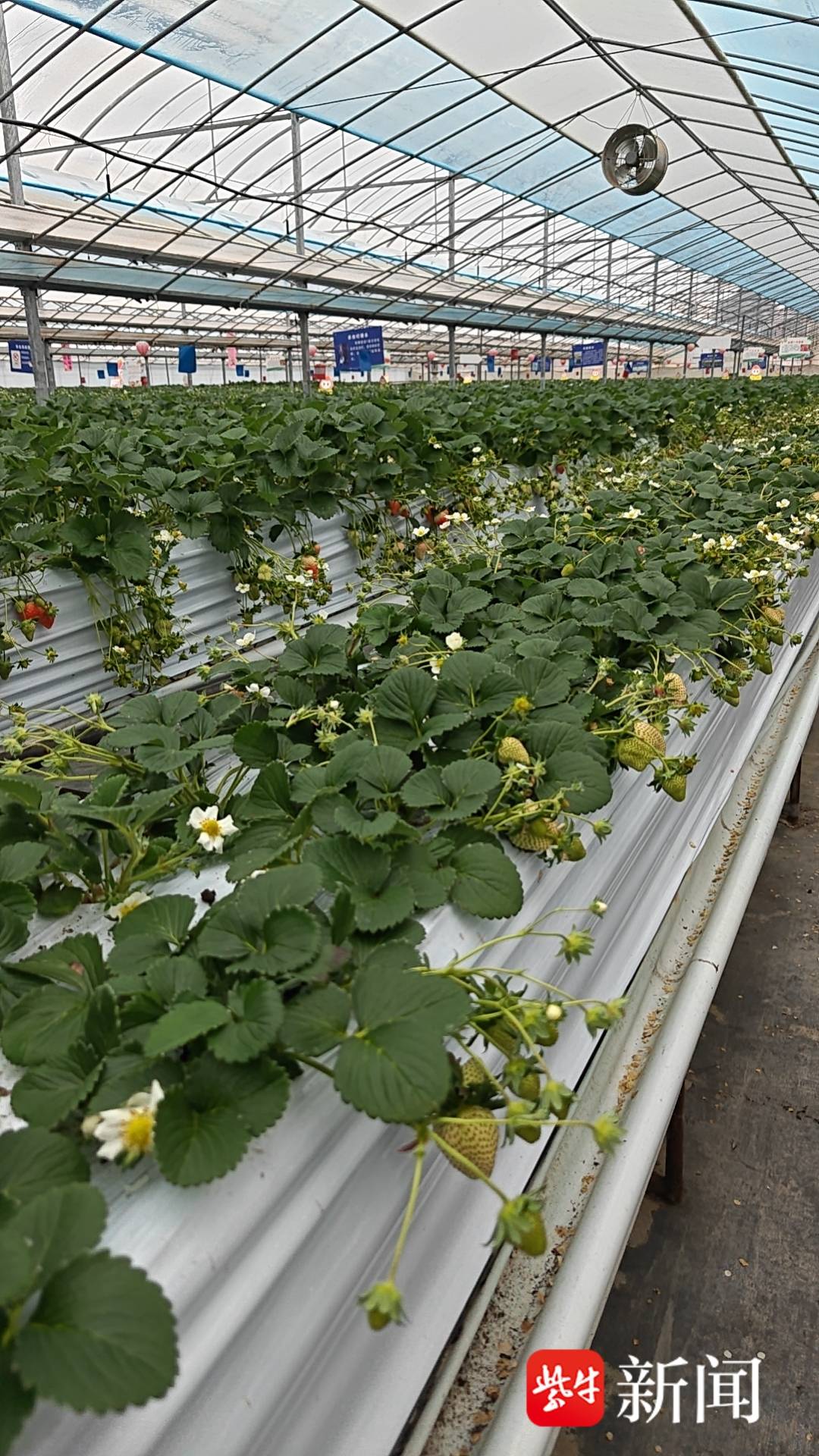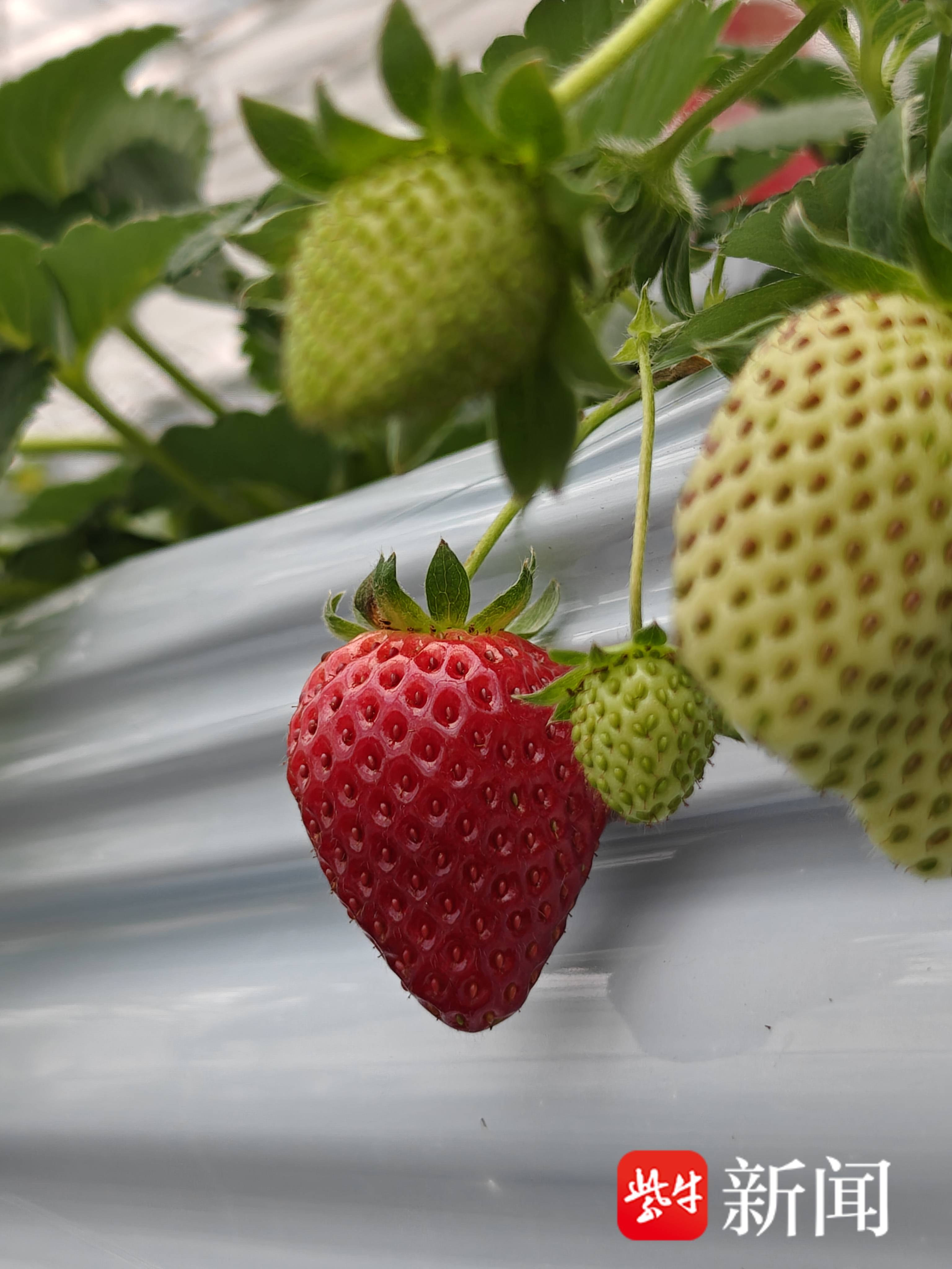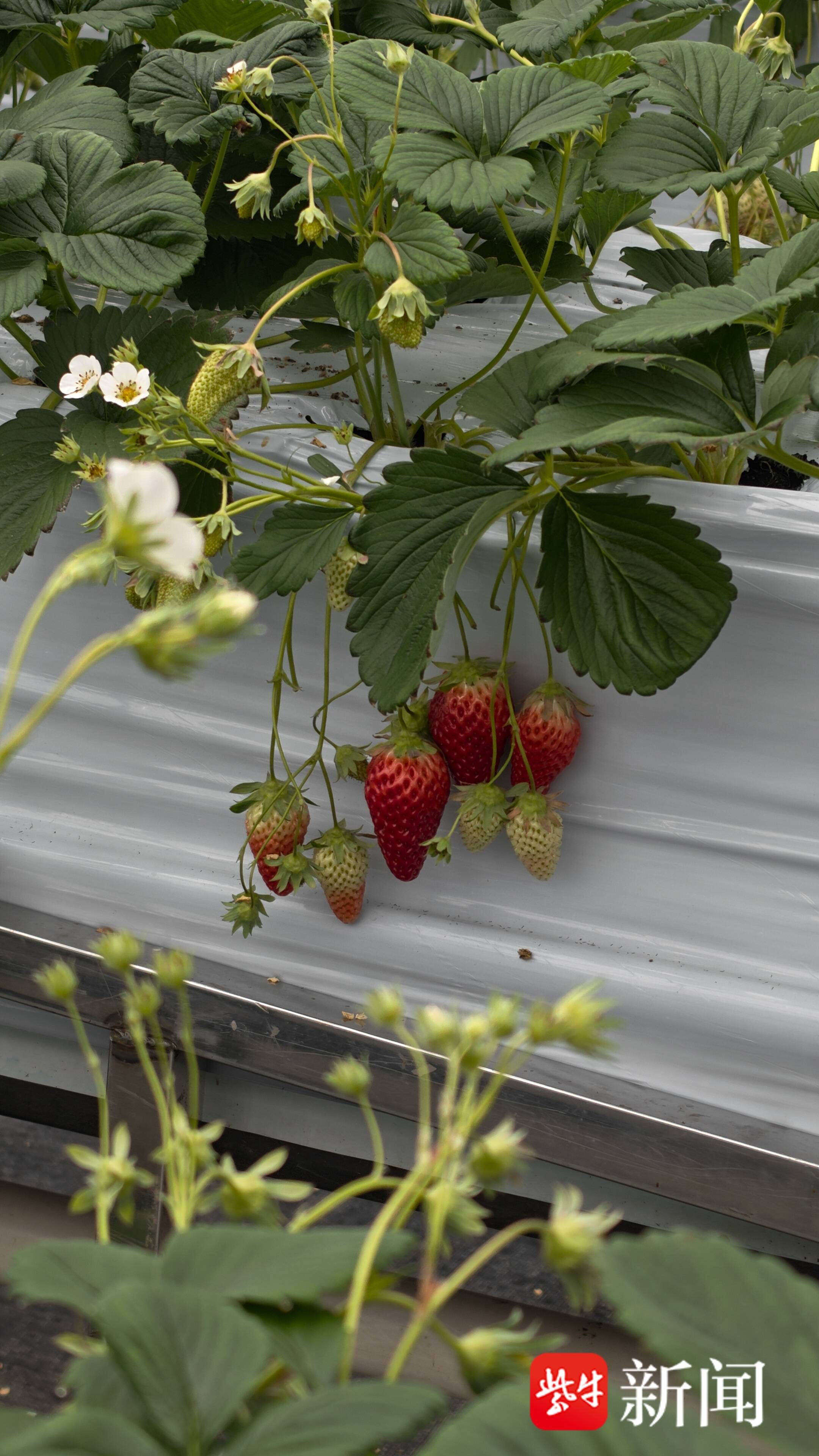 在盐都,草莓早已告别了传统的“面朝黄土背朝天”。记者在潘黄街道新民村看到,由物联网智能管控的现代化大棚。水肥自动输送、温湿度智能调节,草莓住上了“高楼公寓”。这种高架无土栽培技术不仅让土地利用率提升了40%,更使管理效率提高了3倍。