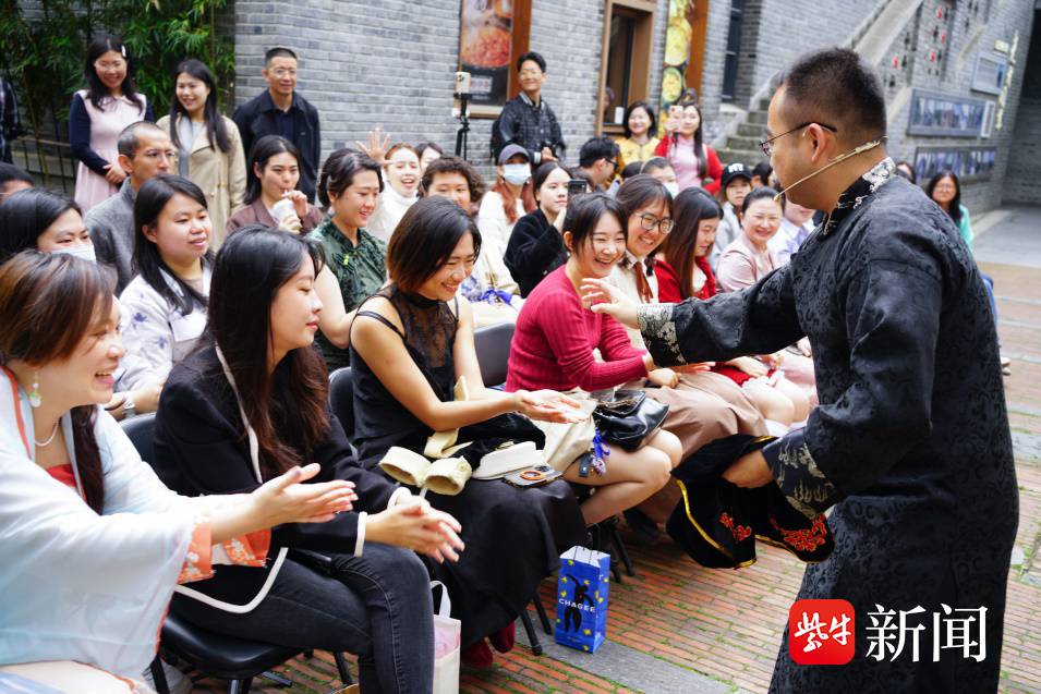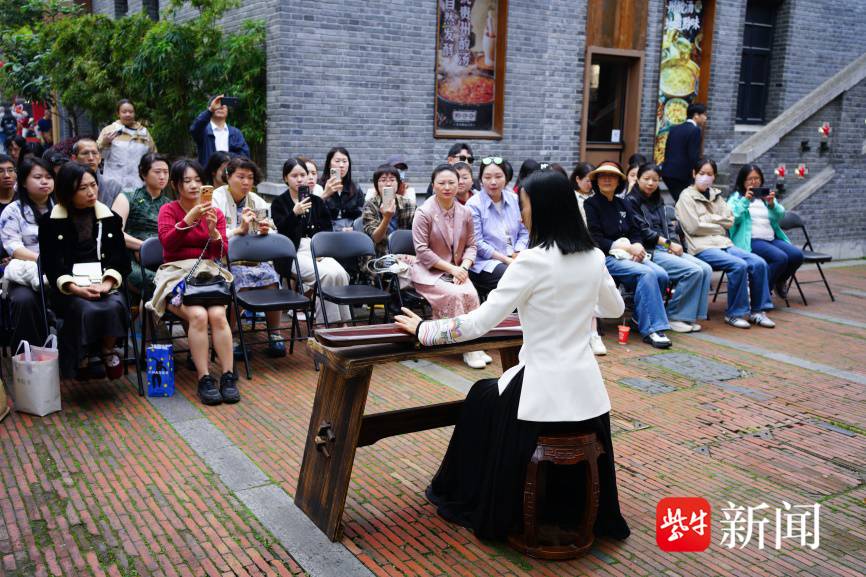 古琴的弦音未绝,两位相声演员一捧一逗,操着一口道地又诙谐的南京方言拉开了架势。“阿吃过啦?”“我滴乖乖”熟悉的南京腔虽然让初来乍到的台湾小伙伴们有些摸不着头脑,但配上相声演员们的一唱一和,熟悉的歌曲演绎,包袱一抖,全场哄堂大笑。通过几句方言教学和歌曲串烧,现场气氛迅速破冰,学员们跟着哼,学着唱,此起彼伏的掌声在门东的巷弄里回荡。
