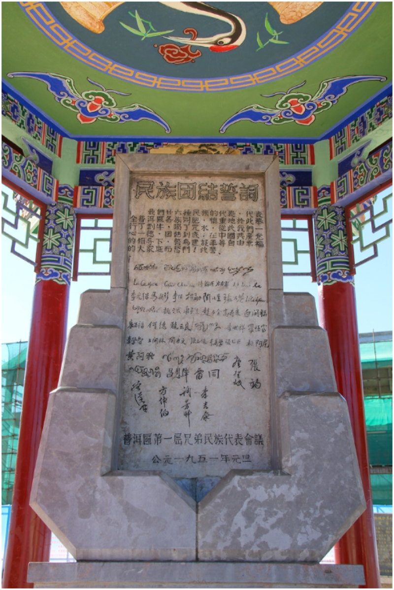 1951年元旦,普洱专区26个民族1000多名群众举行盟誓大会,按照少数民族的风俗习惯立下誓词碑,表示“一心一德,团结到底,在中国共产党的领导下,誓为建设平等自由幸福的大家庭而奋斗!”48名各族代表在誓词碑上庄严地签下自己的名字。