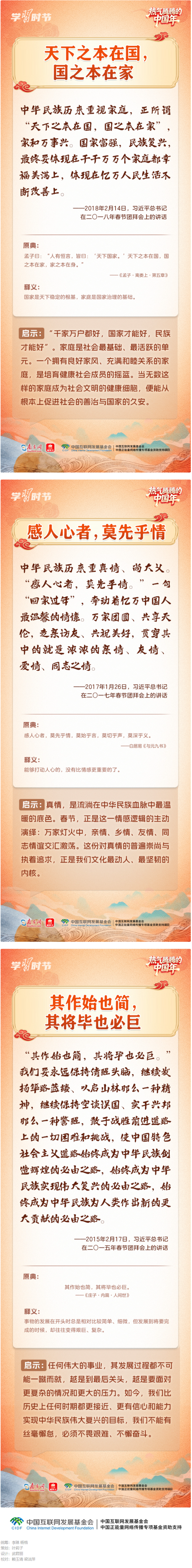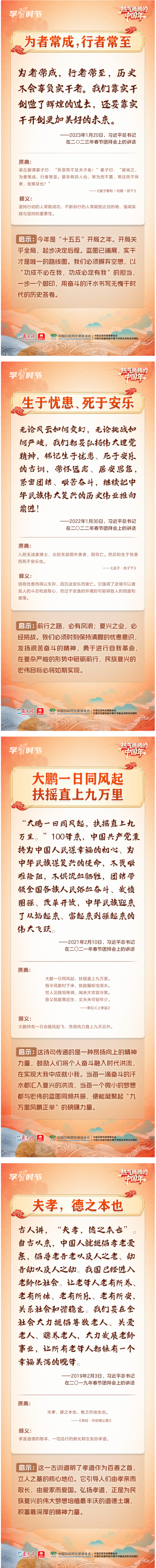 “在中国式现代化新征程上策马扬鞭、勇往直前,共同开创更加美好的未来。”2月14日,在二〇二六年春节团拜会上,习近平总书记的重要讲话振奋人心。党的十八大以来,习近平总书记多次在春节团拜会上发表重要讲话,回望旧岁、展望新年,向大家致以美好的新春祝福。在讲话中,习近平总书记常常巧妙引用古典名句砥砺人心,指引我们脚踏实地、锐意前行,提醒我们珍视亲情、涵养孝道。一起来学习感悟。
