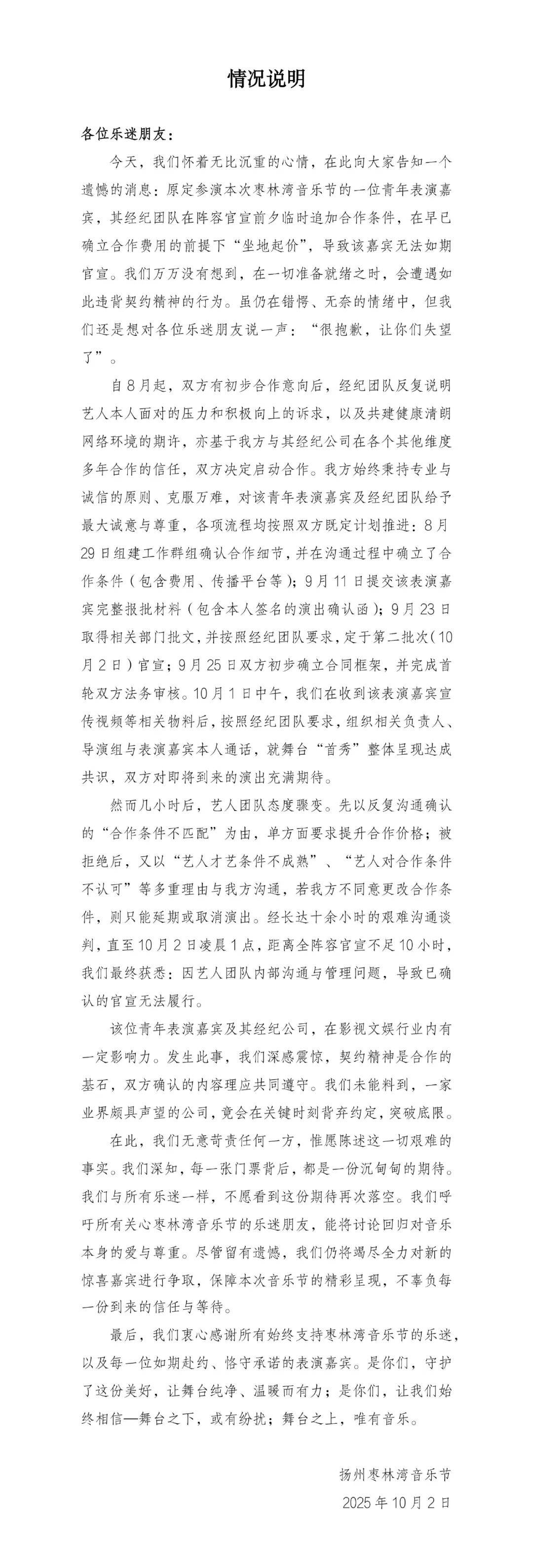 10月2日,@N次方扬州枣林湾音乐节 发布情况说明,称原定参演音乐节的青年表演嘉宾经纪团队在阵容官宣前临时追加合作条件、在已确立合作费用的前提下“坐地起价”,导致无法官宣。