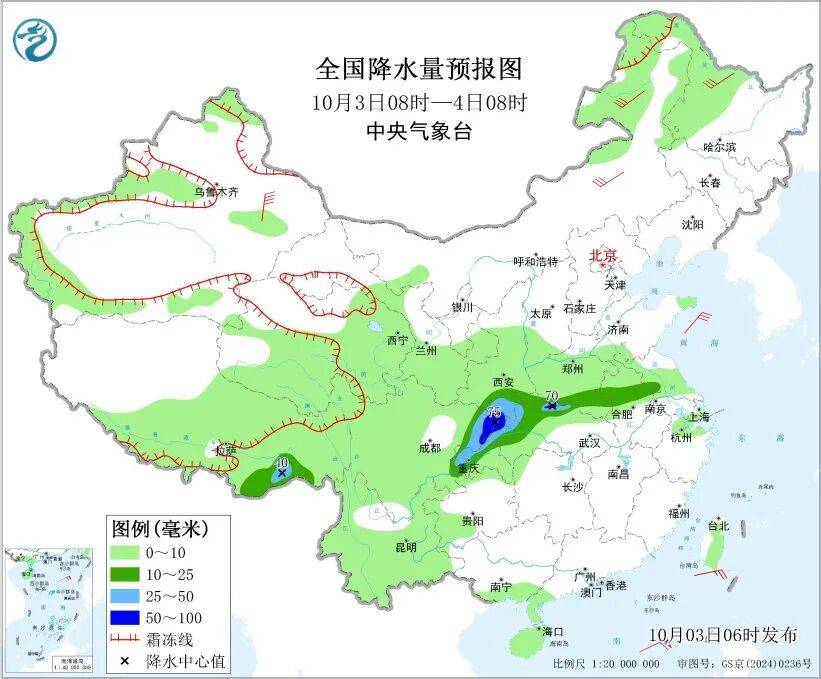 未来三天,甘肃东部、宁夏南部、陕西、四川东部、重庆西部和北部、湖北西部和北部、河南、河北南部、山东、山西、安徽中部等地将有中到大雨,局地有暴雨或大暴雨。