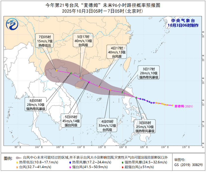 大风预报:3日8时至4日8时,受“麦德姆”影响,巴士海峡、南海东北部和中东部将有6到8级大风、阵风9级,“麦德姆”中心经过的附近海域风力可达9到11级,阵风12到13级。