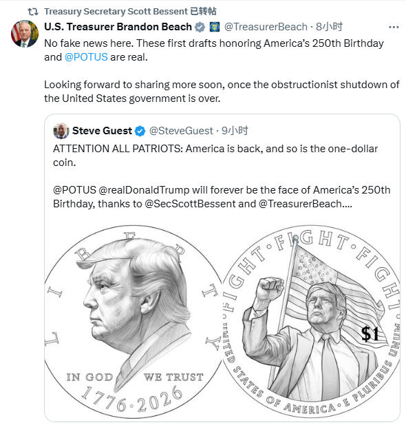 美国财政部官员布兰登·比奇在社交媒体上回应了这一消息,并称“这不是假新闻。这些纪念美国建国250周年的首批初稿是真的。”比奇还写道,一旦美国政府“关门”事件结束,他期待能尽快分享更多相关信息。