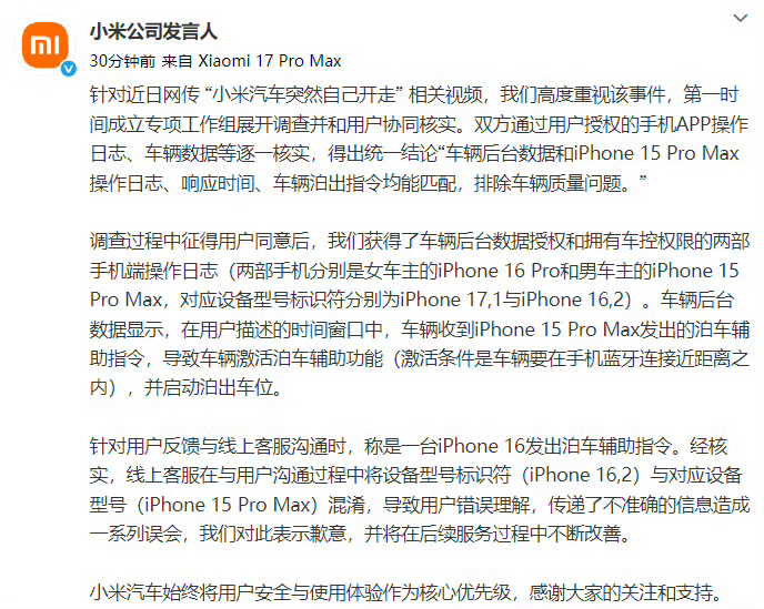 针对近日网传 “小米汽车突然自己开走” 相关视频,我们高度重视该事件,第一时间成立专项工作组展开调查并和用户协同核实。双方通过用户授权的手机APP操作日志、车辆数据等逐一核实,得出统一结论“车辆后台数据和iPhone 15 Pro Max操作日志、响应时间、车辆泊出指令均能匹配,排除车辆质量问题。”