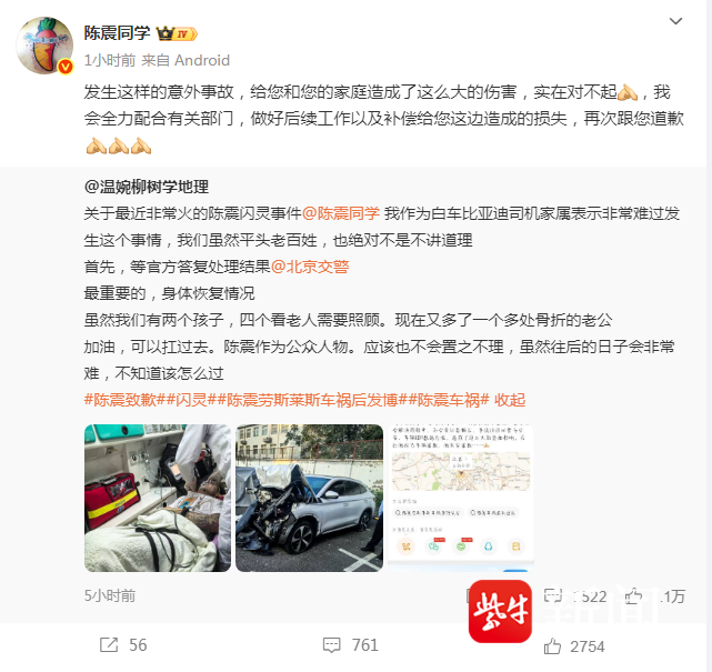 10月5日,有疑似事故另一方车主家属在社交平台上发文,称作为白车比亚迪司机家属,非常难过发生这个事情,目前一方面在等官方答复处理结果,另一方面也看身体恢复情况。“陈震作为公众人物,应该也不会置之不理。”这名家属称。随后,陈震对此进行了转发,并配文称,“发生这样的意外事故,给您和您的家庭造成了这么大的伤害,实在对不起,我会全力配合有关部门,做好后续工作以及补偿给您这边造成的损失,再次跟您道歉!”