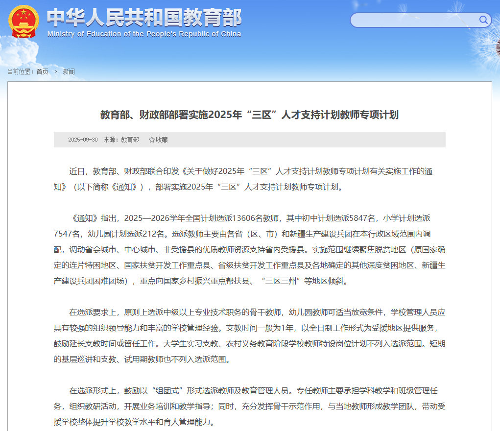 两部门部署实施2025年“三区”人才支持计划教师专项计划 详情