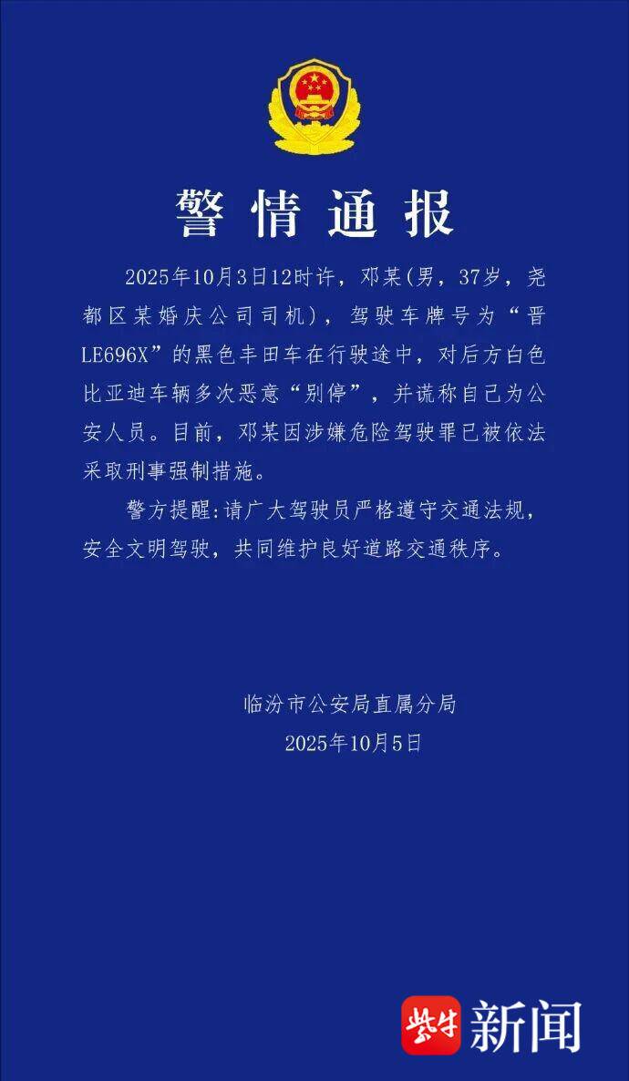男子恶意别车还自称是“公安”?警方通报:系某婚庆公司司机,已刑拘! 详情