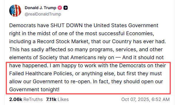 特朗普在社交媒体上发文称:“我们很乐于与民主党就他们失败的医保政策或任何事项合作,但首先他们需要让我们的政府重新开门。事实上,他们应该今晚就让我们的政府开门。”