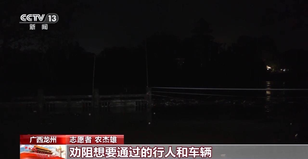 志愿者 农杰雄:我们24小时轮班值守,主要任务是一边密切观察水位变化,一边封控桥和前面的低洼路段,劝阻想要通过的行人和车辆。
