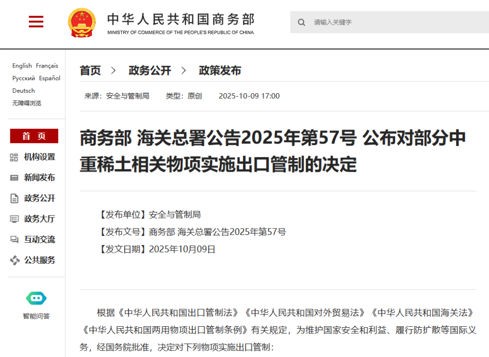 原标题:商务部 海关总署公告2025年第57号 公布对部分中重稀土相关物项实施出口管制的决定