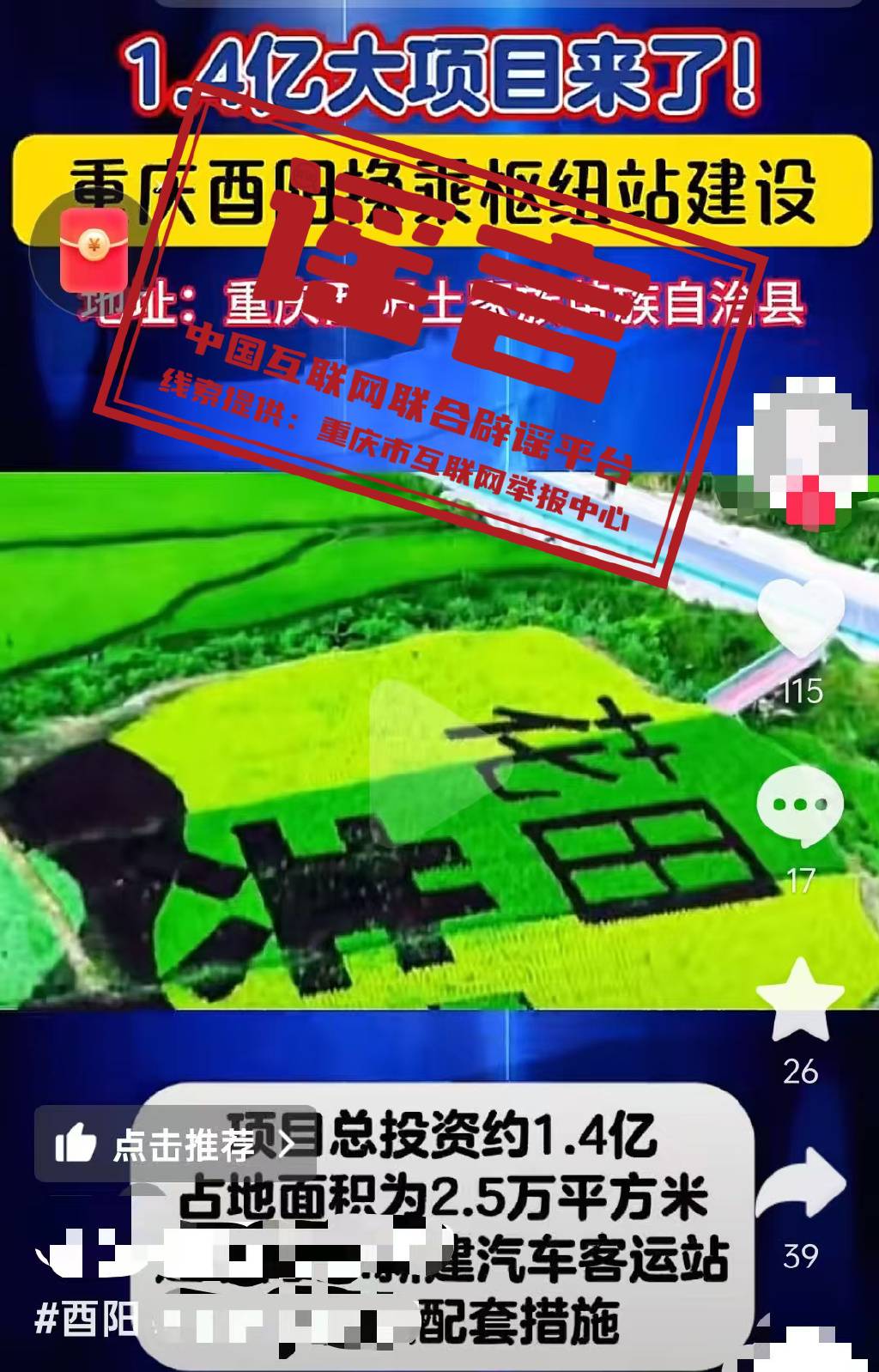 真相:近日,有网民发布信息称“1.4亿大项目来了,重庆酉阳换乘枢纽站建设,新建汽车客运站及相关配套”,引发关注。经重庆市酉阳县交通运输委核实,酉阳县正在推进桃花源景区游客集散中心提升项目,暂无“1.4亿建设换乘枢纽站”项目,网传信息系谣言。(来源:“重庆辟谣”微信公众号)