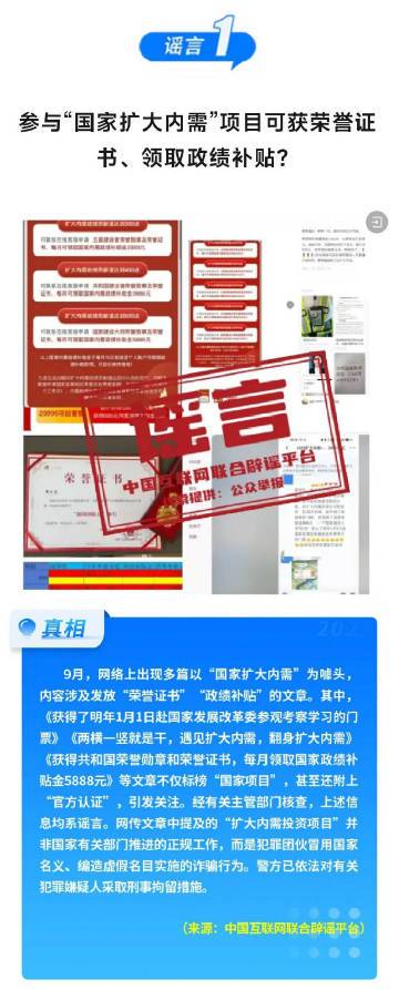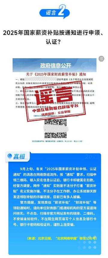 参与“国家扩大内需”项目可获荣誉证书、领取政绩补贴?2025年国家薪资补贴按通知进行申领、认证?“中国三农”APP投资理财定期分红、到期返还收益?阅兵式上有“错字”?台风“桦加沙”是史上最强台风?中国互联网联合辟谣平台盘点2025年9月热传谣言,遏制谣言传播空间,净化网络生态,营造风清气正的网络环境。