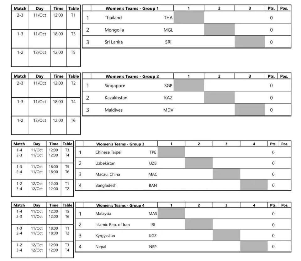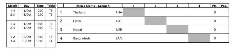 10月11日全天和12日白天场次将进行小组赛,12日晚场(北京时间18:30起)开始进行1/4决赛和8强以外排位赛的争夺,15日将进行女团决赛(北京时间17:30)和男团决赛(北京时间20:00)的最终争夺。