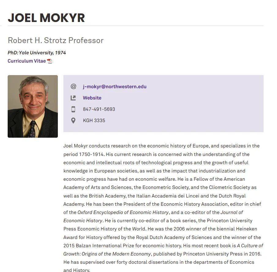 西北大学官网显示,乔尔·莫基尔研究欧洲的经济史,专注于1750-1914年期间。他是美国艺术与科学学院、计量经济学会、历史计量学会、英国学院、意大利国家科学院和荷兰皇家学院的会员。他曾是经济史协会的主席,《牛津经济史百科全书》的主编,以及《经济史杂志》的联合编辑。他目前是普林斯顿大学出版社世界经济发展史系列书籍的共同编辑。他的最新书籍是《增长的文化:现代经济的起源》,由普林斯顿大学出版社于2016年出版。