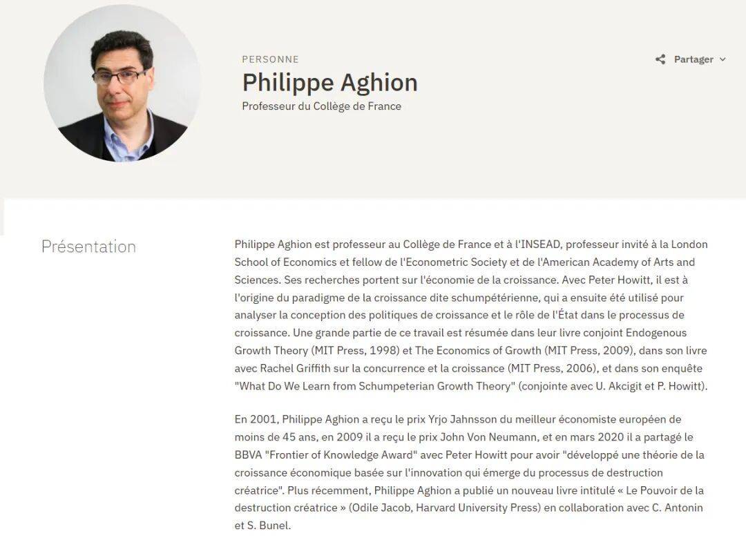 菲利普·阿吉翁于1956年出生于法国巴黎,1987年毕业于美国马萨诸塞州剑桥市哈佛大学,获博士学位。现任法国巴黎法兰西公学院和欧洲工商管理学院教授,以及英国伦敦政治经济学院教授。