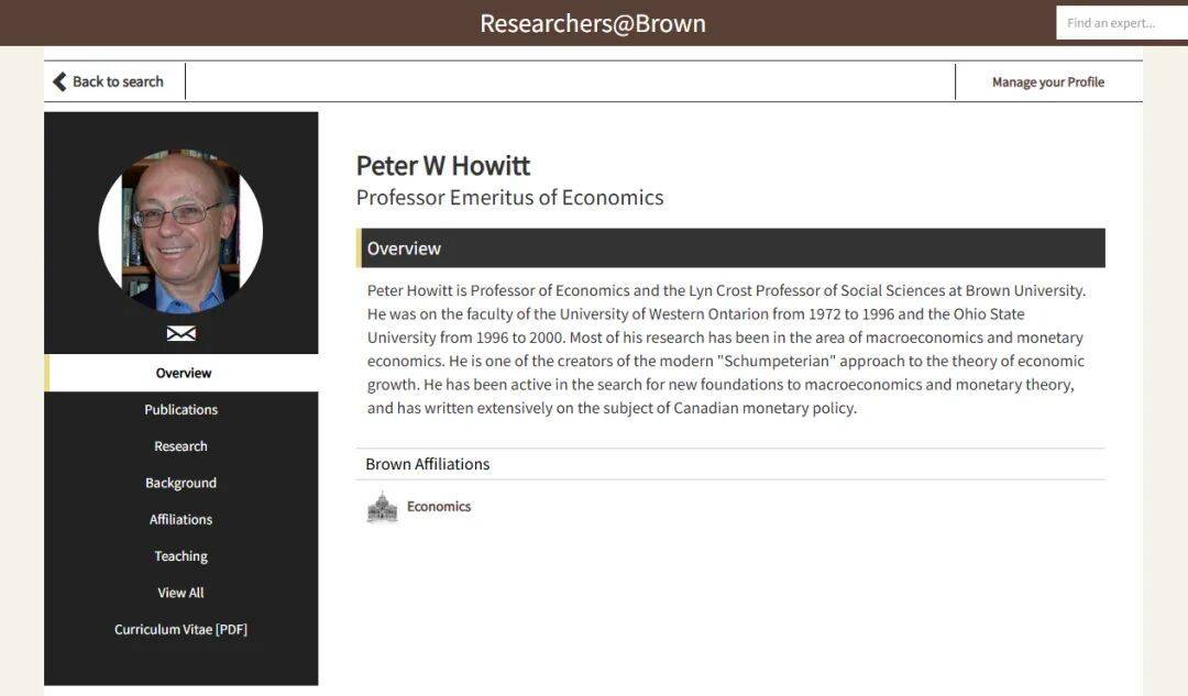 布朗大学官网介绍,彼得·豪伊特从1972年到1996年在西安大略大学任教,从1996年到2000年在俄亥俄州立大学任教。他的大部分研究都集中在宏观经济学和货币经济学领域。他是现代“熊彼特式”经济增长理论的创建者之一。他一直在为宏观经济学和货币理论寻找新的基础,并且在加拿大货币政策方面发表了大量文章。