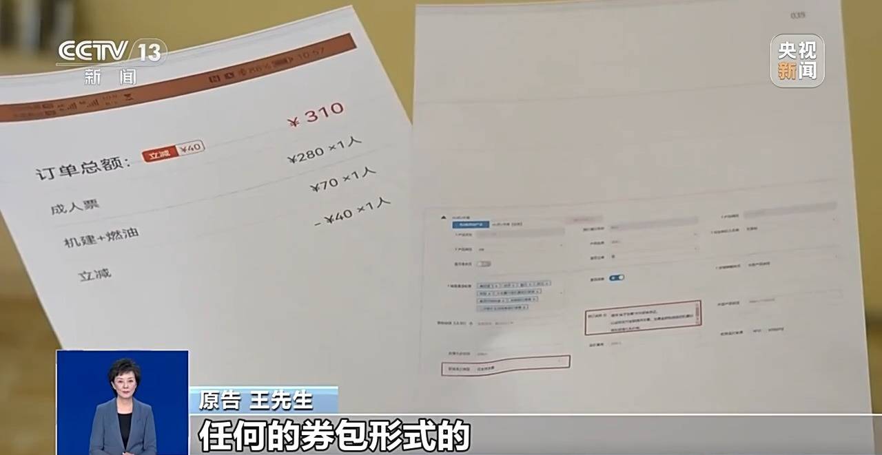 北京互联网法院审判管理办公室主任 李文超:平台方没有向这个原告消费者提前告知310元的机票构成是有300元的票款,另外还有10元的外卖的券。第二个是平台的下单页面,显示涉案的机票是有立减40的优惠,导致原告作为消费者陷入了错误的认识,他认为从被告的平台上下单,比从航空的官网上下单更优惠,产生了这种下单的行为。