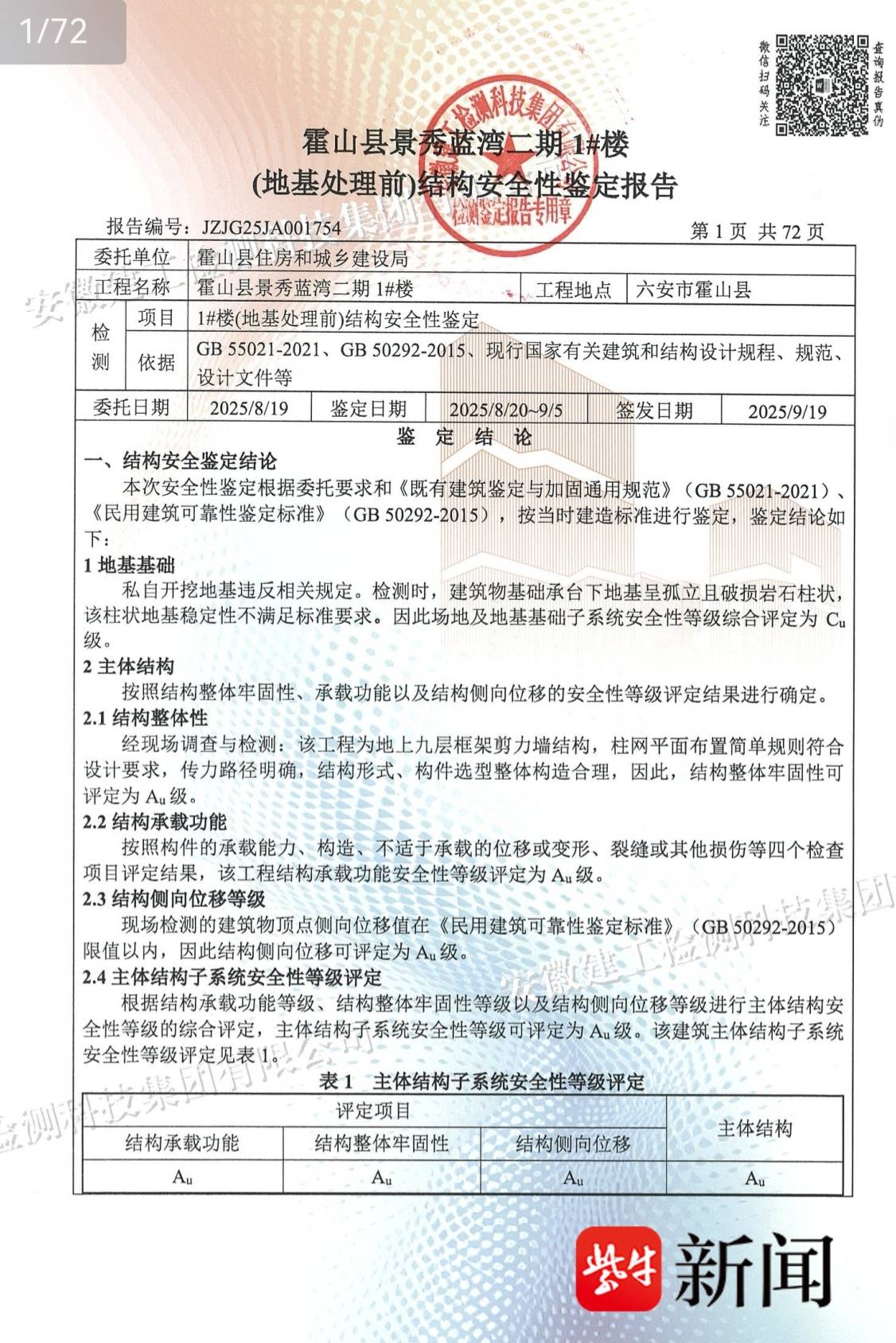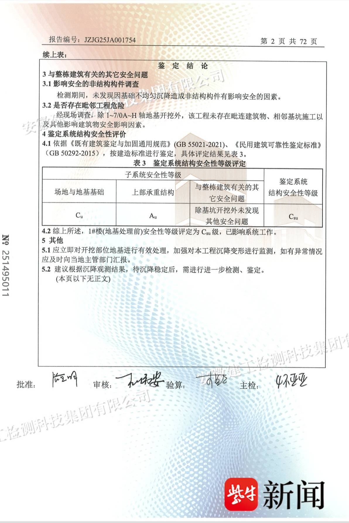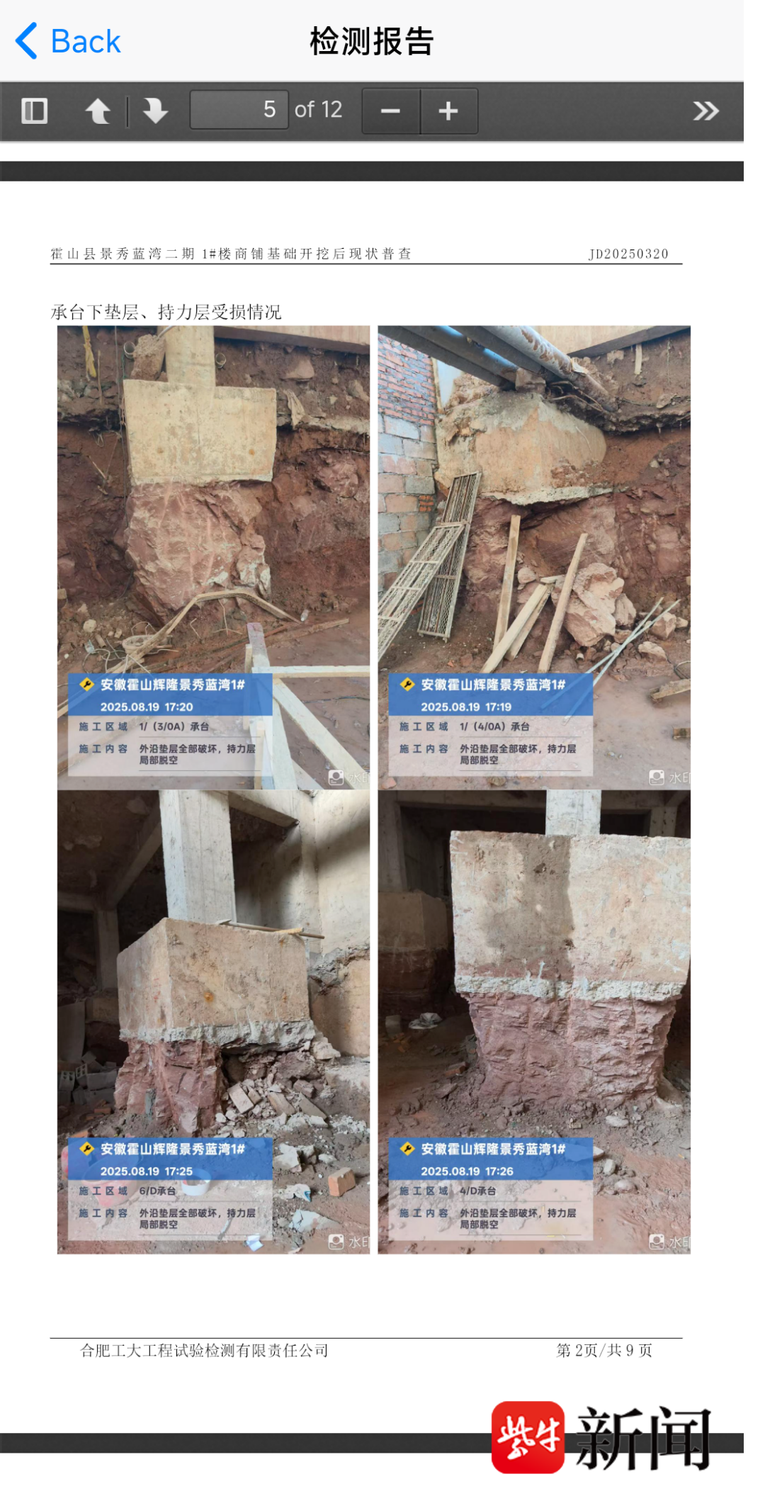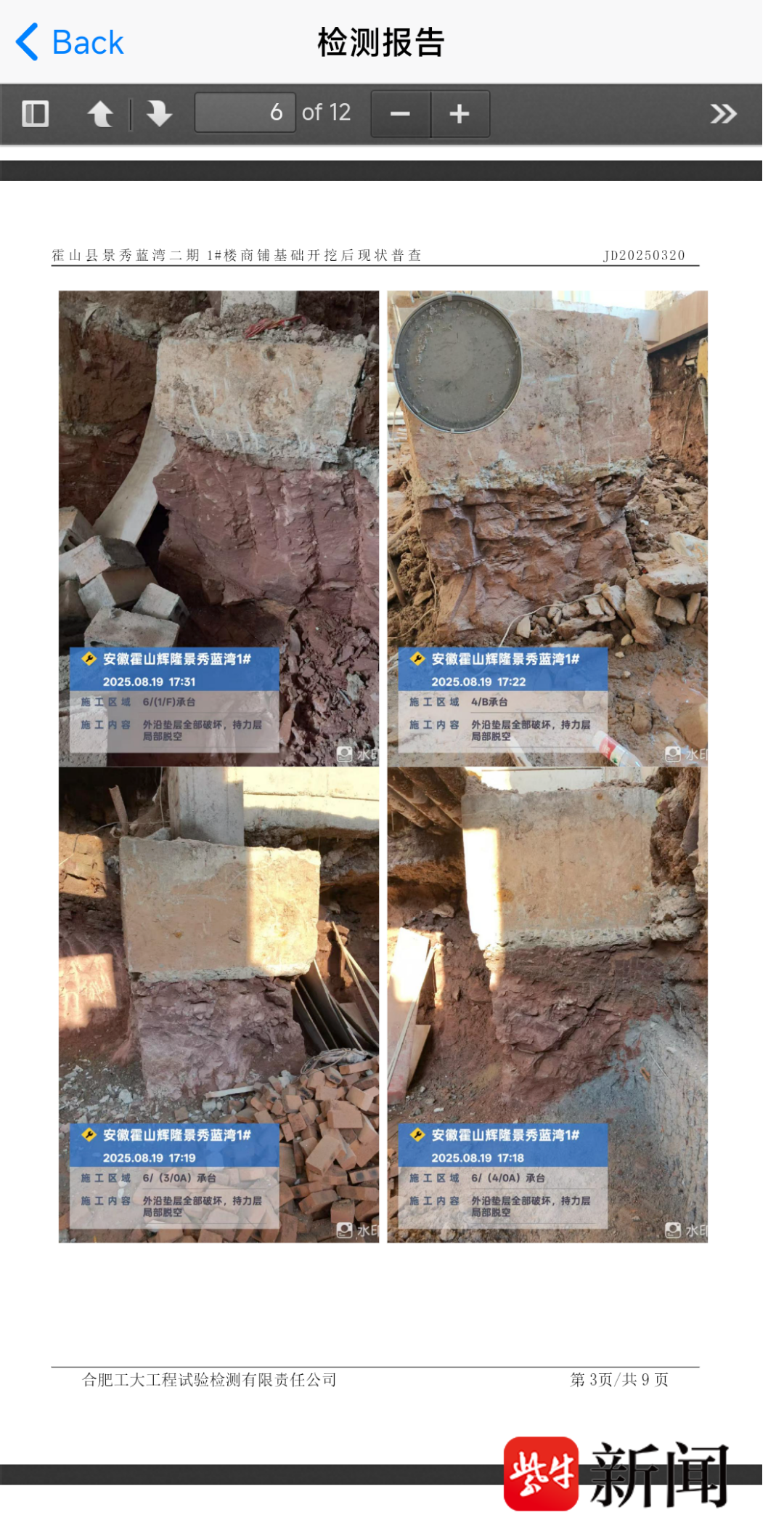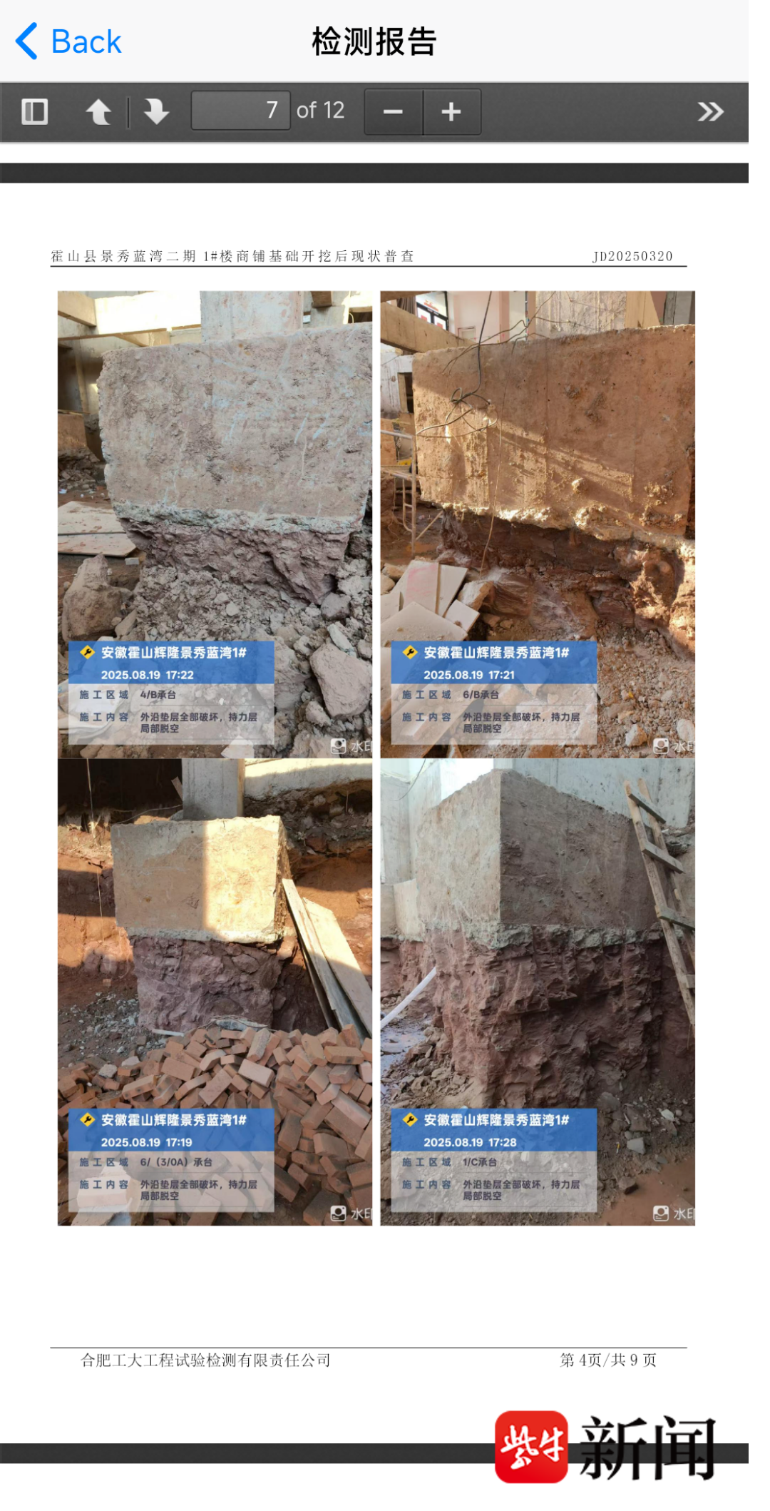 该小区一位业主向扬子晚报紫牛新闻记者提供了另一份由安徽建工检测科技集团有限公司出具的检测鉴定报告。该报告委托日期为8月19日,其鉴定结论中称,“私自开挖地基违反相关规定。检测时,建筑物基础承台下地基呈孤立且破损岩石柱状,该柱状地基稳定性不满足标准要求。因此场地及地基基础子系统安全性等级综合评定为Cu级。”
