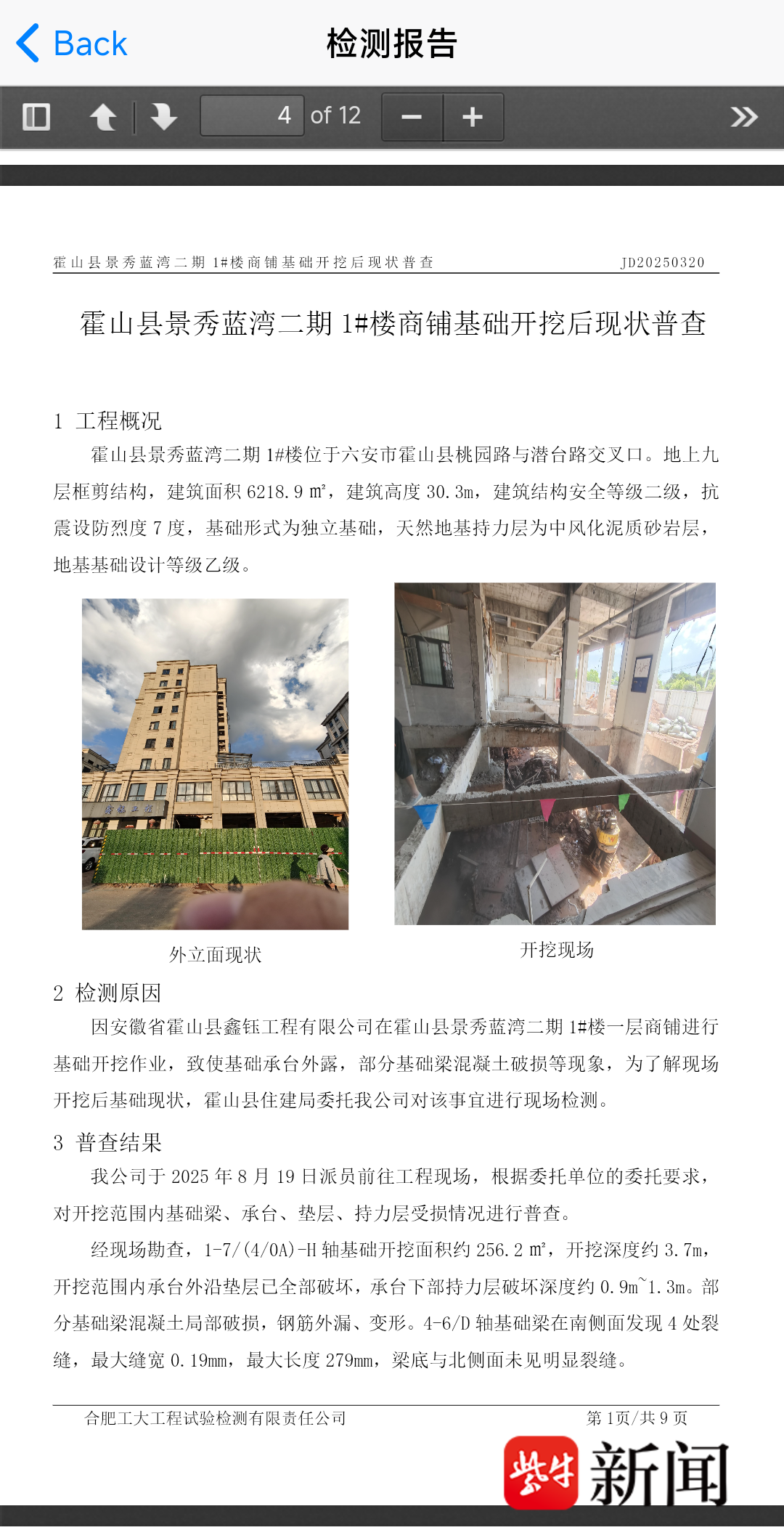 该小区多位业主向扬子晚报紫牛新闻记者提供了相关证据,经梳理发现,一份由合肥工大工程试验检测有限责任公司出具的《霍山县景秀蓝湾二期1#楼商铺基础开挖后现状普查》中称,“因安徽省霍山县鑫钰工程有限公司在该处商铺进行基础开挖作业,导致基础承台外露,部分基础梁混凝土破损等现象,为了解现场开挖后基础现状,霍山县住建局委托该公司进行现场检测。”