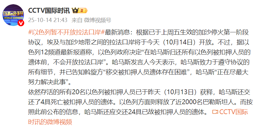 最新消息:根据已于上周五生效的加沙停火第一阶段协议,埃及与加沙地带之间的拉法口岸将于今天(10月14日)开放。不过,据以色列12频道最新报道称,以色列政府决定“在哈马斯归还所有以色列被扣押人员的遗体前,不会开放拉法口岸”。哈马斯发言人今天表示,哈马斯致力于遵守协议的所有细节,并已告知斡旋方“移交被扣押人员遗体存在困难”,哈马斯“正在尽最大努力解决此事”。