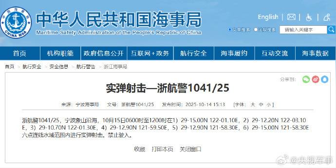 据中国海事局网站消息,宁波海事局发布航行警告,10月15日4时至8时、10月15日6时至12时,宁波象山沿海进行军事演练,禁止驶入。