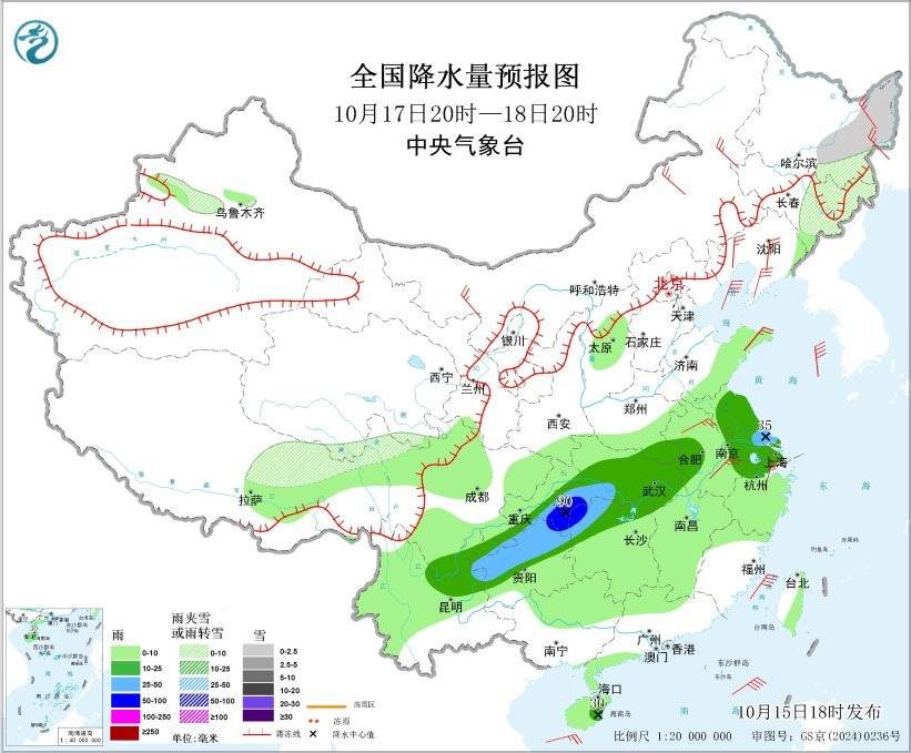 10月15日20时至16日20时,黑龙江东部、内蒙古东部、新疆沿天山地区等地有小到中雪或雨夹雪,新疆沿天山地区东部局地有大雪;内蒙古中部、陕西北部和南部、甘肃东部、上海、湖北南部、湖南北部、重庆东南部、贵州东北部和西部、四川南部、云南西南部等地部分地方有中到大雨,其中湖北南部和湖南北部等地局部地方有暴雨(50~80毫米)。新疆东部、西藏西北部、青海北部和西部、甘肃河西、宁夏、内蒙古西部等地的部分地区有5~6级、阵风7~9级的大风;渤海将有7级、阵风8~9级的大风(见图2)。
