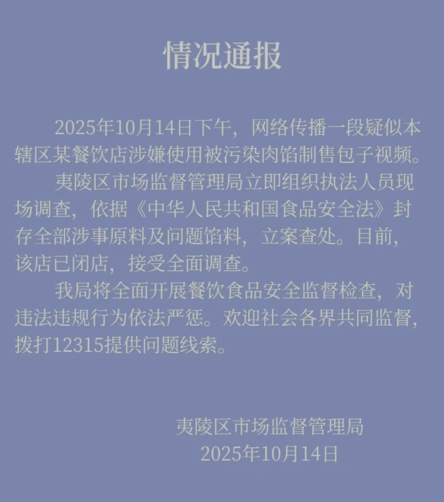 记者注意到,湖北省宜昌市夷陵区市场监督管理局就此发布情况通报,通报称,2025年10月14日下午,网络传播一段疑似本辖区某餐饮店涉嫌使用被污染肉馅制售包子视频。夷陵区市场监督管理局立即组织执法人员现场调查,依据《中华人民共和国食品安全法》封存全部涉事原料及问题馅料,立案查处。